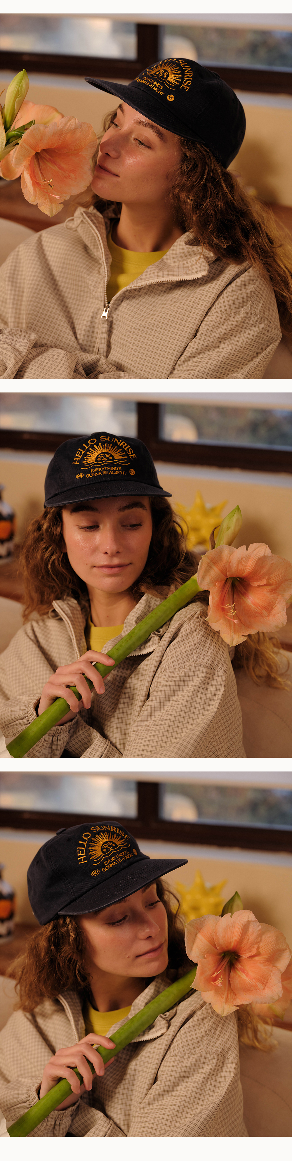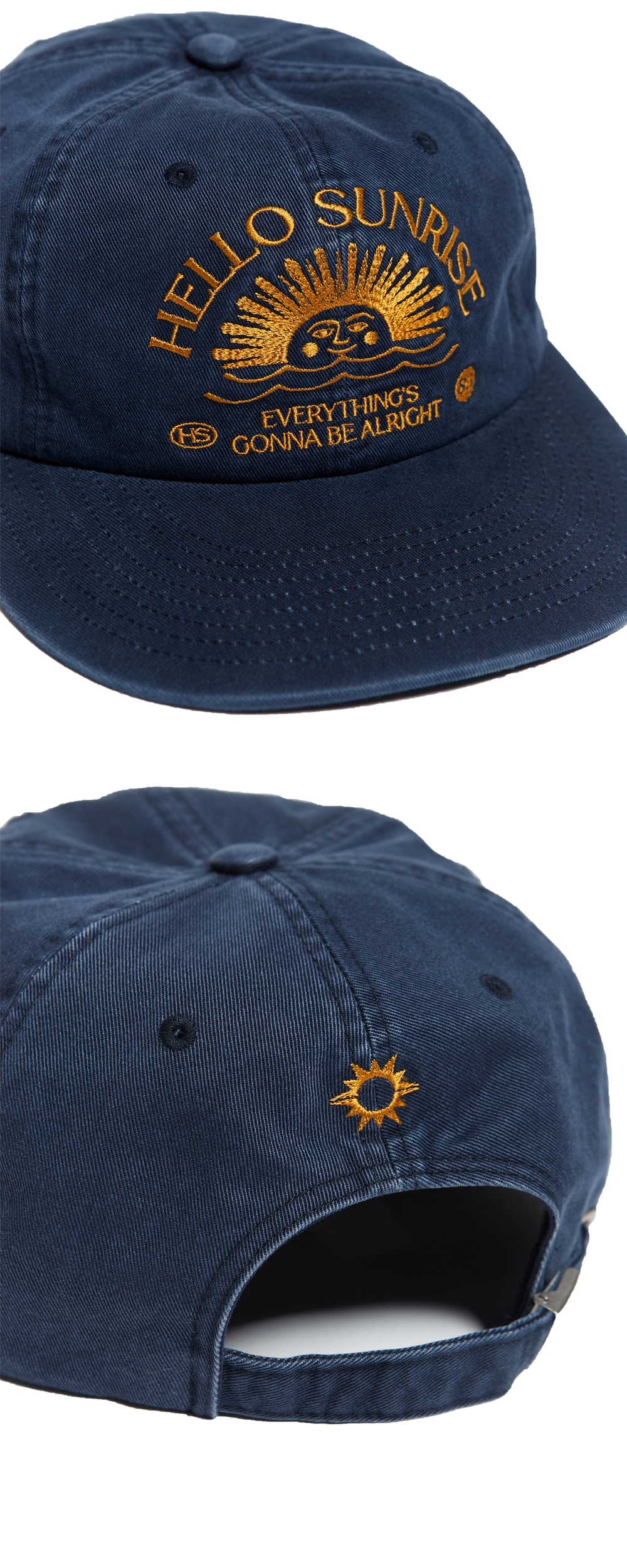 헬로선라이즈 아치 로고 그래픽이 자수로 들어간 6패널 캡입니다. 워싱 가공으로 빈티지한 무드를 더하였으며 뒤판 작은 심볼을 자수 처리하여 포인트를 주었습니다.