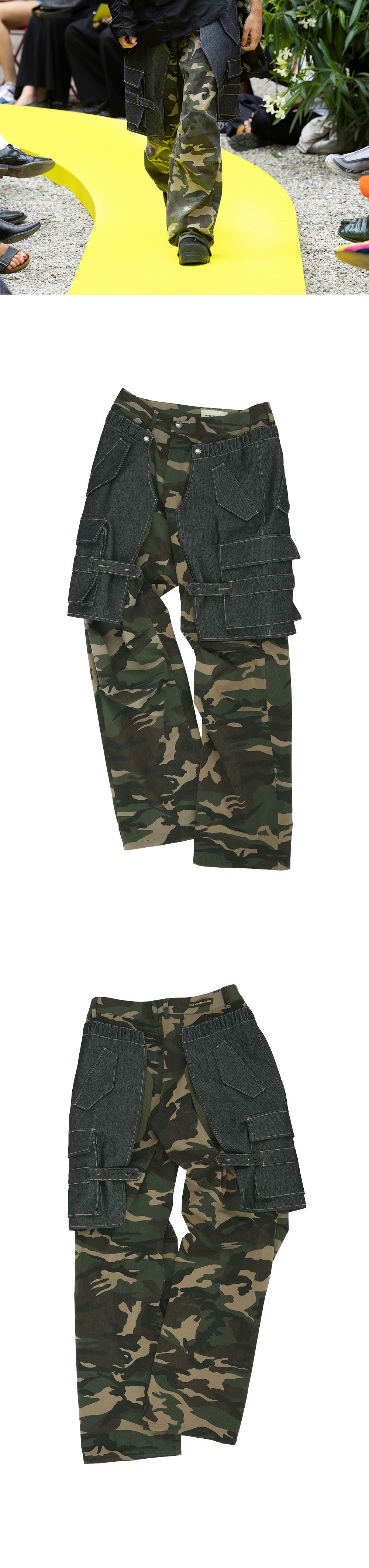 - Long Length 와이드한 실루엣 - 카모플라쥬 & 데님 콤비네이션 - 팬츠 레이어드 디자인 - 입체 카고 포켓과 밴드, 밑단 스트링, Tuck 디테일 * 실제 상품에는 허리 밴드 후면 로고가 없습니다.
