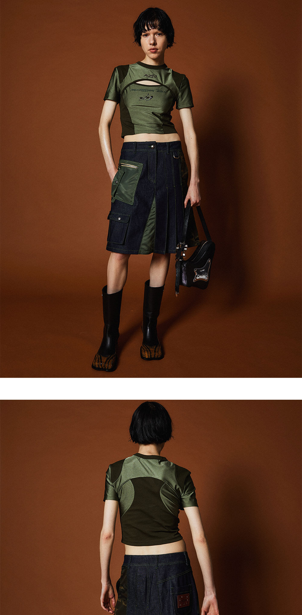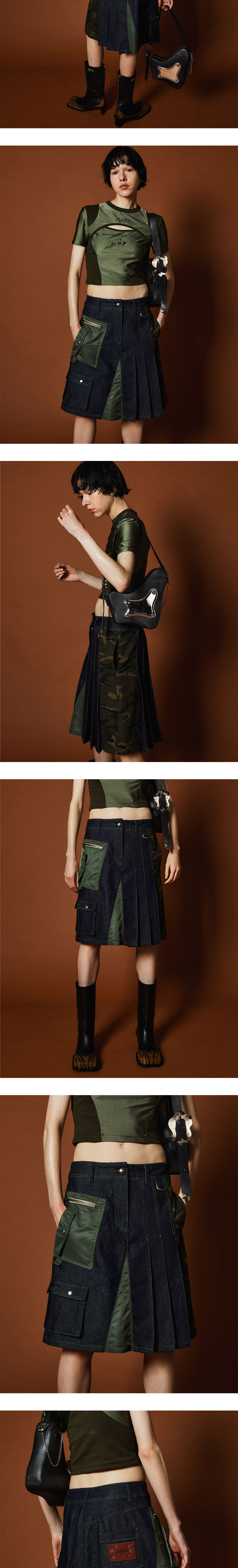- MA-1 커스텀 디자인의 하프 플리츠 스커트 - 세미 에이라인 실루엣 - 데님, MA-1 트윌, CAMOUFLAGE 립스탑 소재의 콤비네이션 - ADSB Andersson Bell Metal Zipper, ADSB JEANS Leather Patch