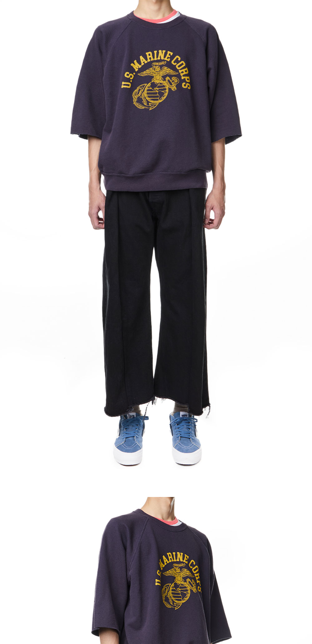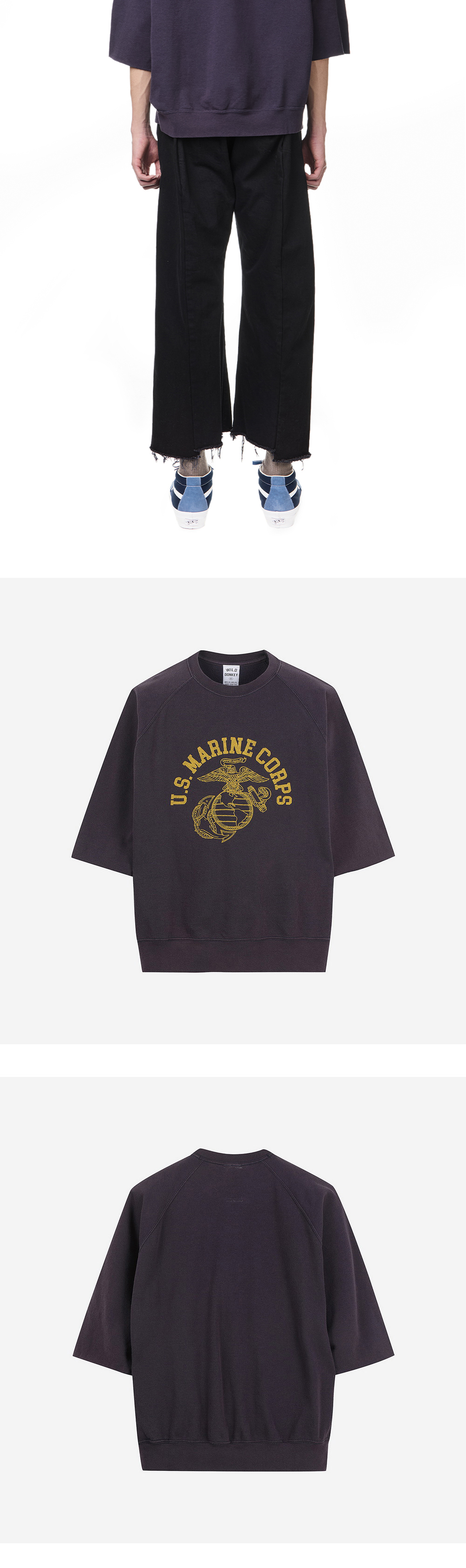 빈티지한 무드의 그래픽이 돋보이는 와일드 동키의 마린 스웨트셔츠입니다. - 바랜 듯한 텍스처의 빈티지 프린팅 디테일 - 숏슬리브 스웨트셔츠 스타일 * 모델 신체 스펙 - 185cm / 착용 사이즈 - L