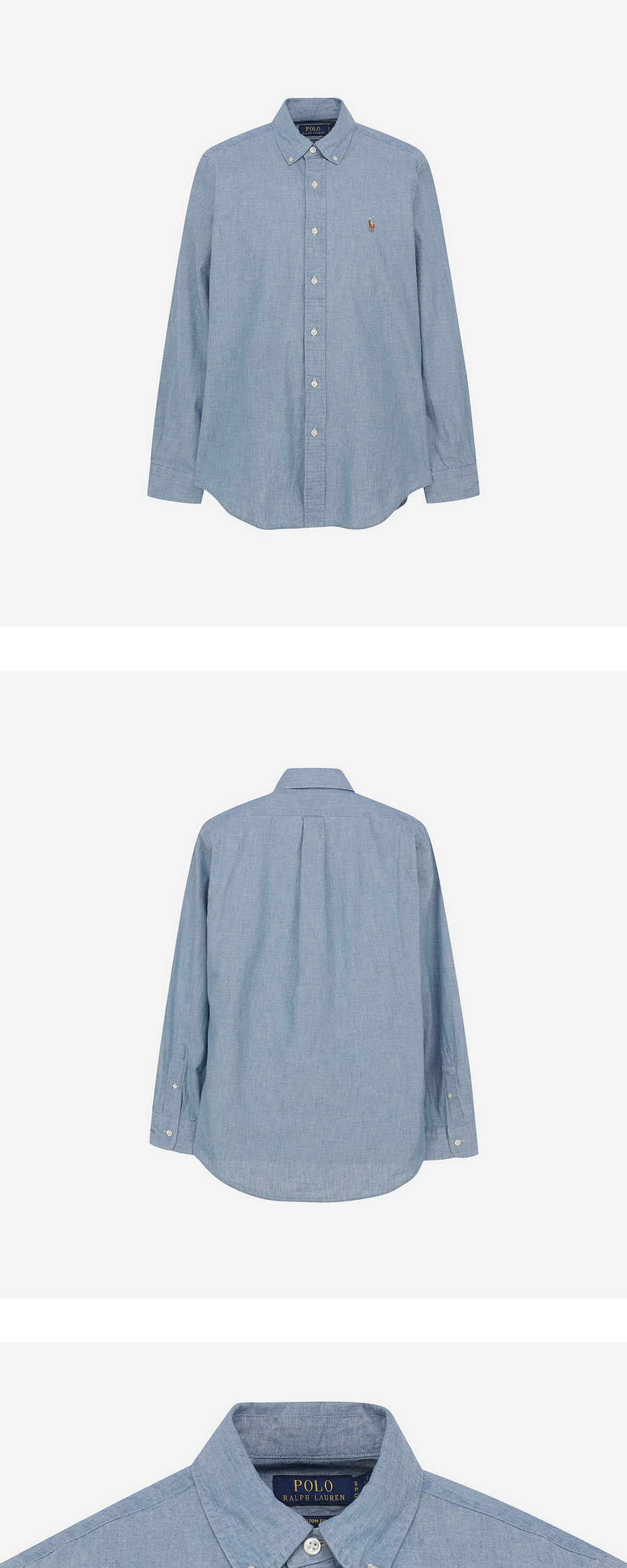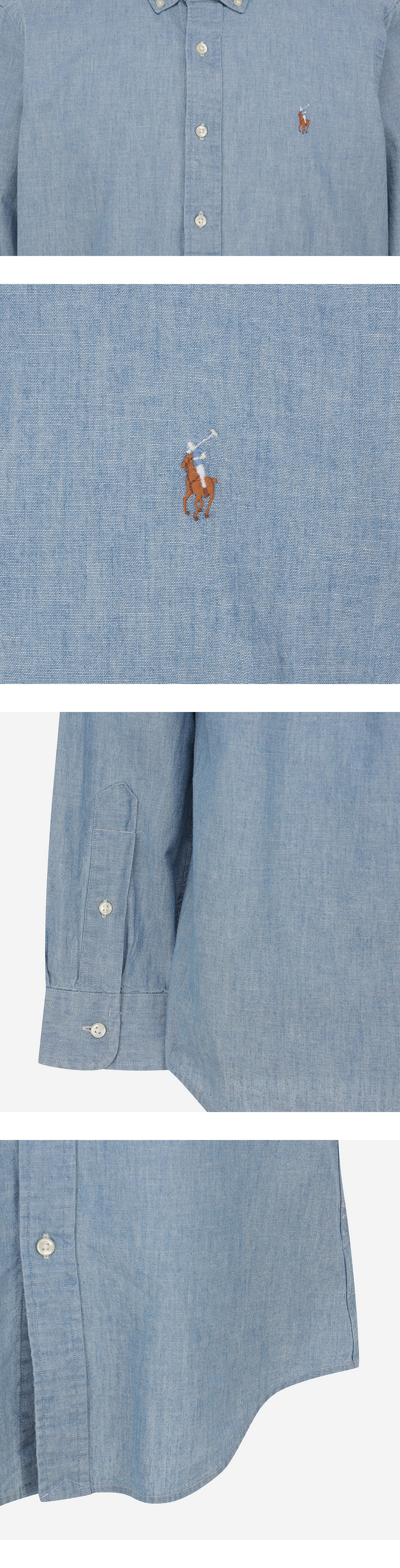 < KREAM은 랄프로렌 코리아 공식 파트너사로 모든 상품은 랄프로렌 코리아(유)에서 공급받은 정식 수입 제품입니다 > 내구성 있는 코튼 샴브레이 소재의 트림 버튼다운 셔츠로, 랄프 로렌의 포니 시그니처 자수가 돋보이는 디자인입니다. - 커스텀핏: 클래식핏과 슬림핏 사이의 트림한 실루엣 - 버튼다운 포인트 칼라, 버튼 플래킷 - 버튼 배럴 커프스, 롱 슬리브 - 박스 플리츠가 있는 뒷면의 스플릿 요크가 편안한 핏과 뛰어난 활동성을 보장 * 소매 부분이 접힌 상태로 배송될 수 있습니다.