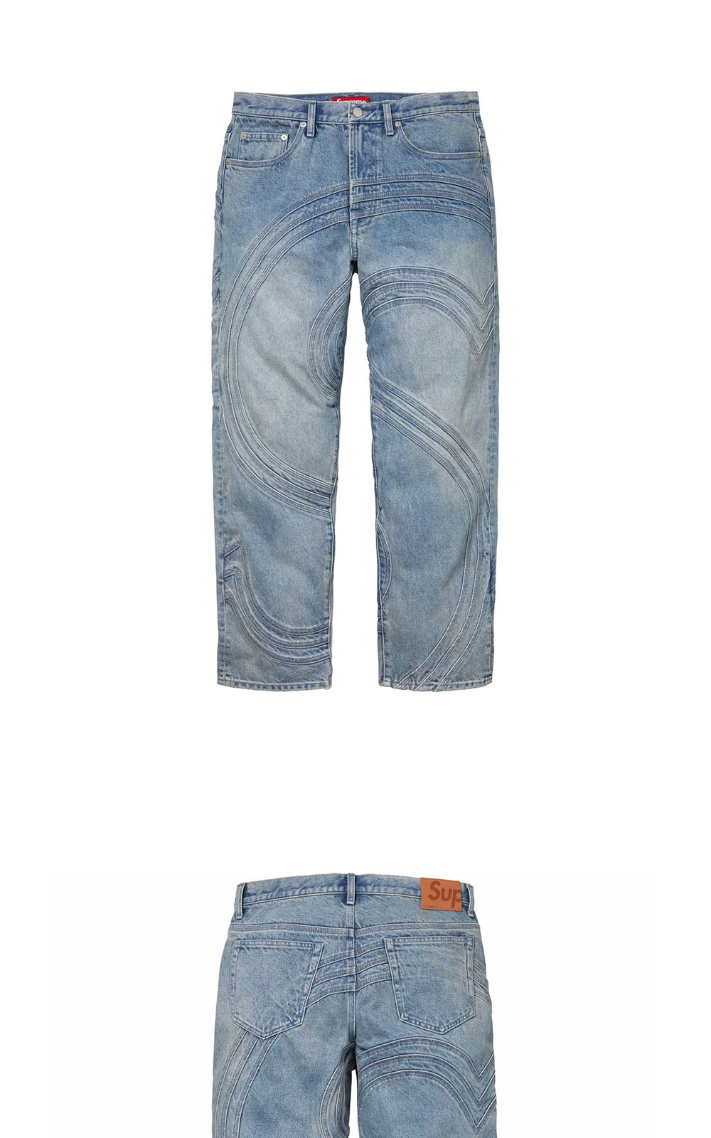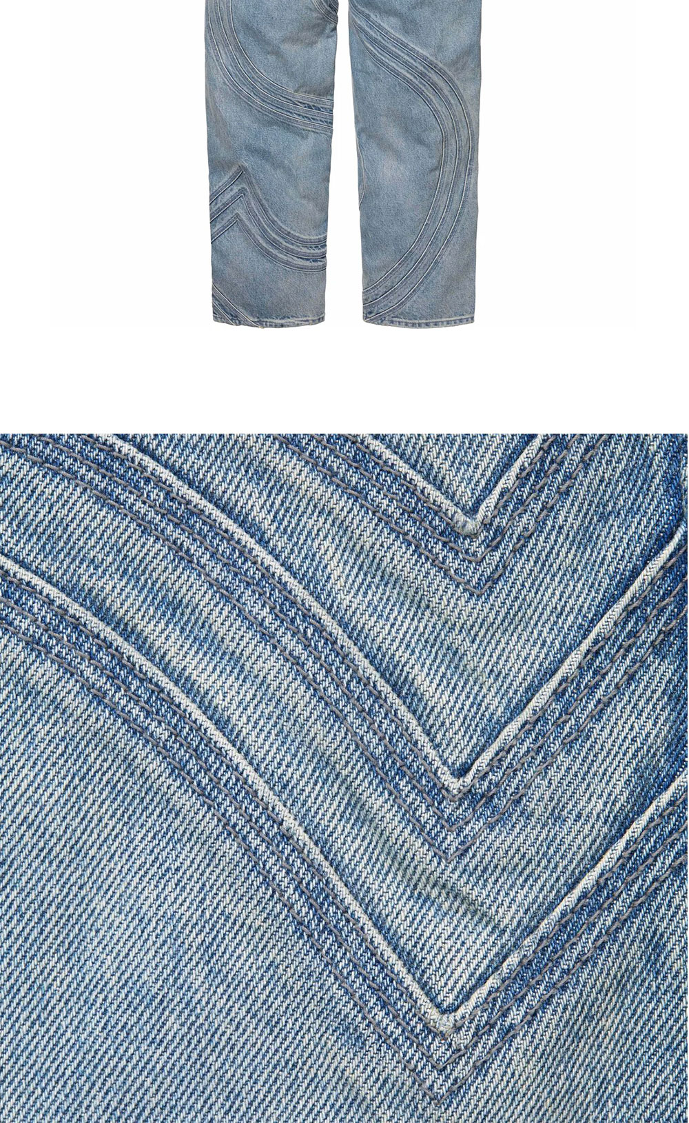 - All cotton 13 oz. denim with paneled seam logo and loose fit - Classic 5-pocket style with zip fly, single coin pocket and leather logo patch on back