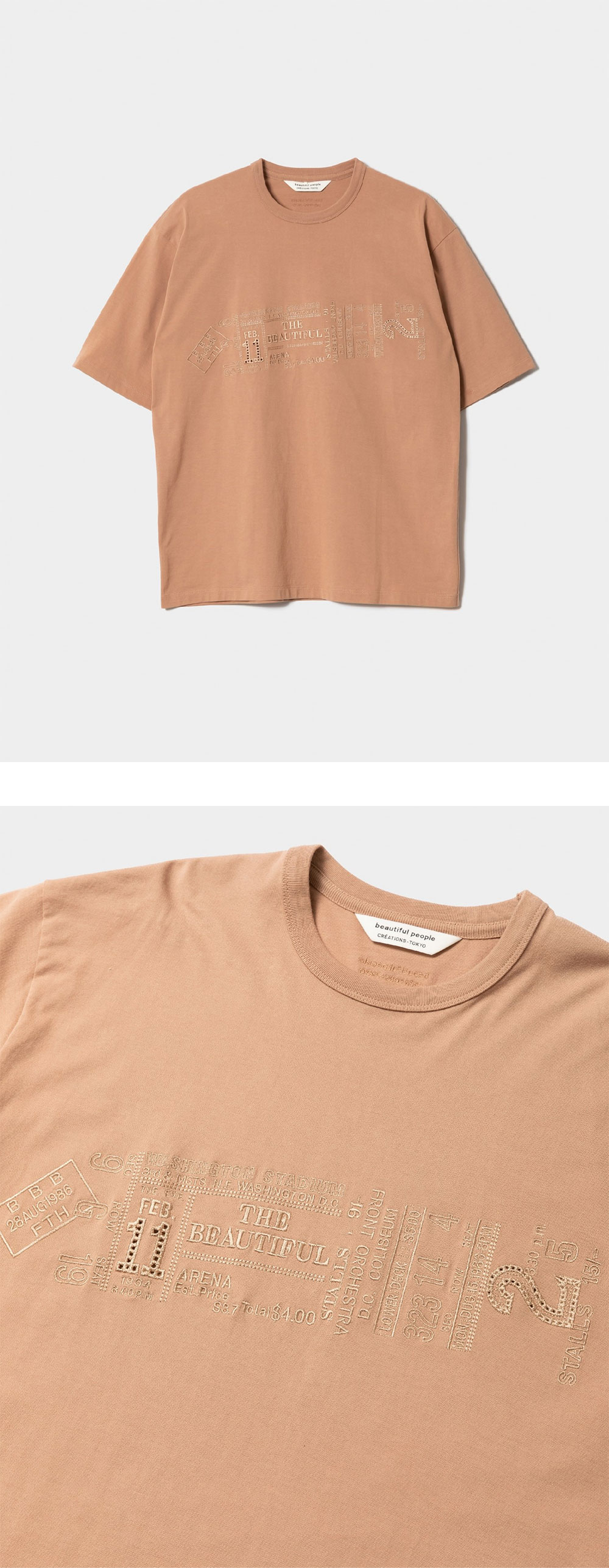 라이브 티켓을 모티브로 한 그래픽을 섬세한 자수로 표현한 Beautiful People의 엠브로이더리 티셔츠입니다. - 소매 길이가 살짝 긴 심플한 티셔츠 - 앞면의 라이브 티켓 모티브의 자수 - 사이즈 선택에 따라 다양한 느낌을 줄 수 있는 숏슬리브 티셔츠