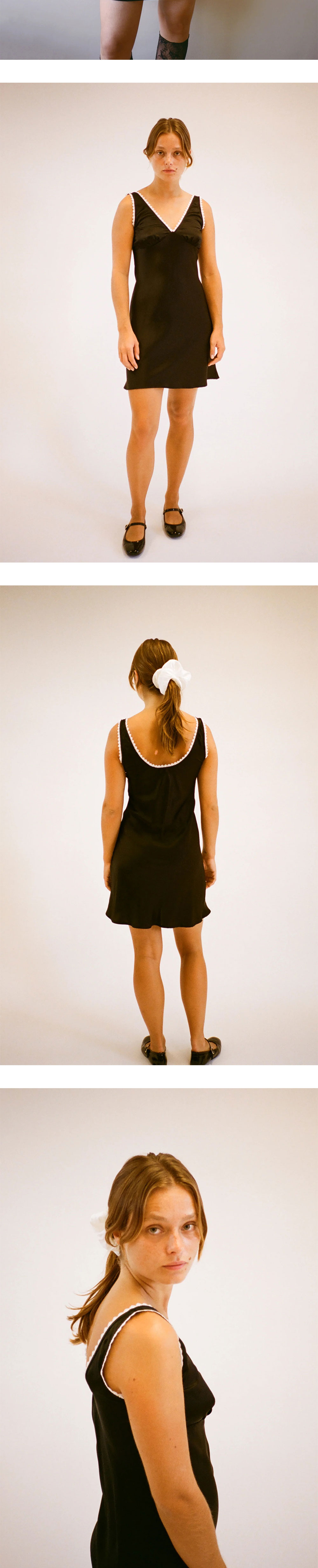 블랙 컬러의 하이 우먼 아나이스 드레스는 시크한 실크 새틴 슬립 드레스로, V넥 라인을 따라 이어지는 달콤하고 장난기 있는 섬세한 화이트 레이스 트림이 특징입니다. - 100% 새틴 실크 - V넥 라인 - 레이스 디테일 - 짧은 길이 *모델 신체 스펙 - 175cm / 착용 사이즈 - S
