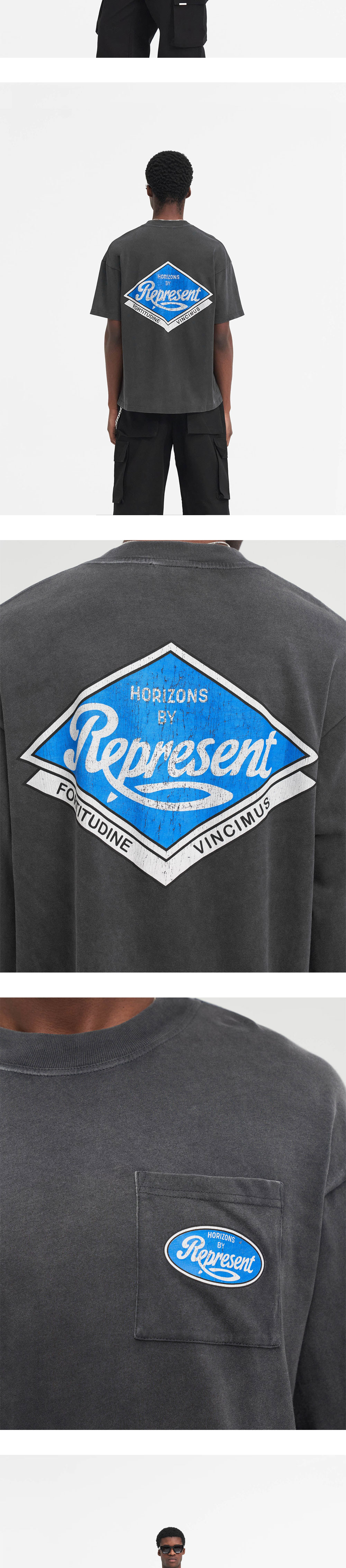 중간 무게감의 저지 면으로 제작된 오버사이즈 핏의 티셔츠를 소개합니다. Horizons Motorsport에게 영감받은 그래픽 디자인과 밑단의 Represent 로고 메탈 바가 특징입니다. - Model is 182cm and 73kg wearing size Medium