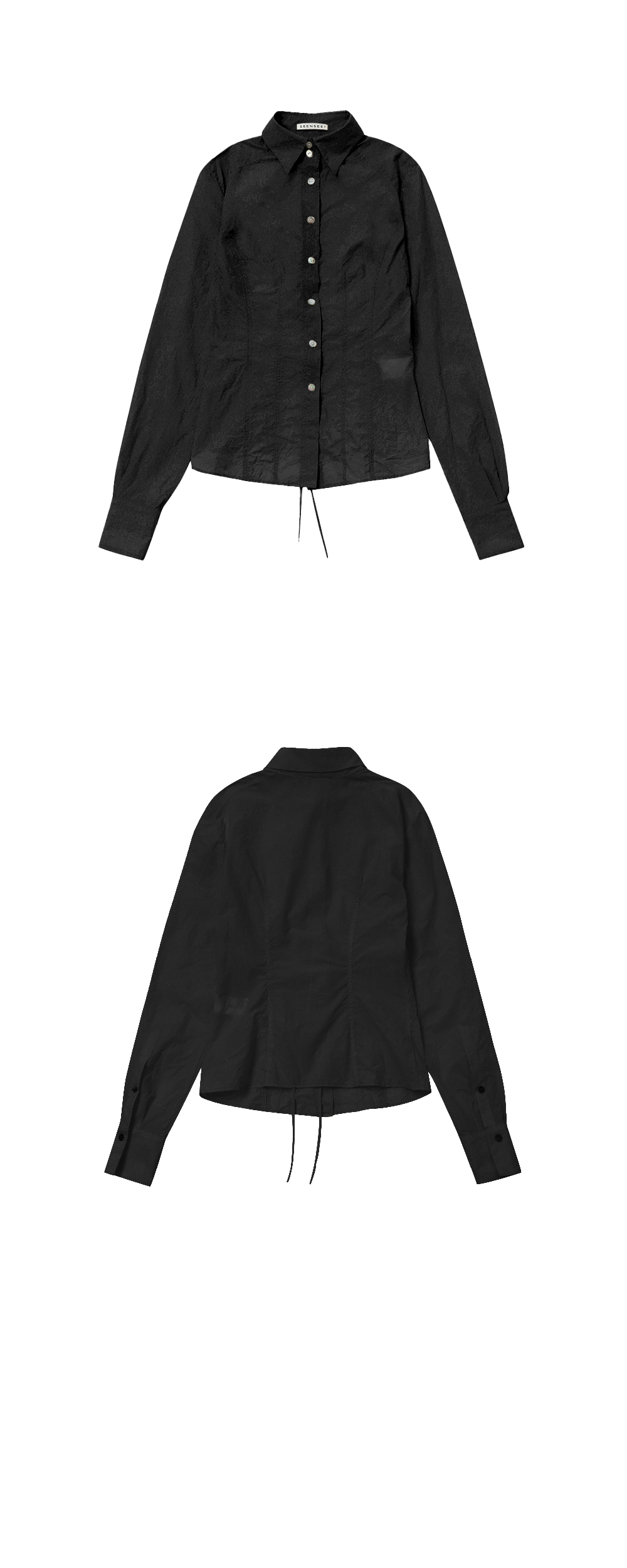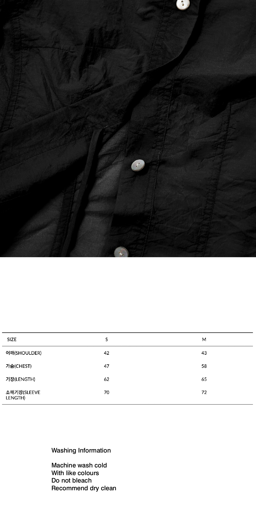 Wrinkled fabric Recycle nylon fabric Two strap at front Double stitched detail Natural mother of pearl buttons Slim fit 주름 가공 원단 리사이클 나일론 소재 앞면 두개의 스트랩 더블 스티치 디테일 자개 단추 슬림 핏 Made in South Korea Washing Information Machine wash cold With like colours Do not bleach Recommend dry clean