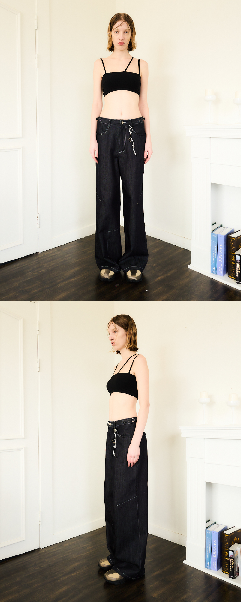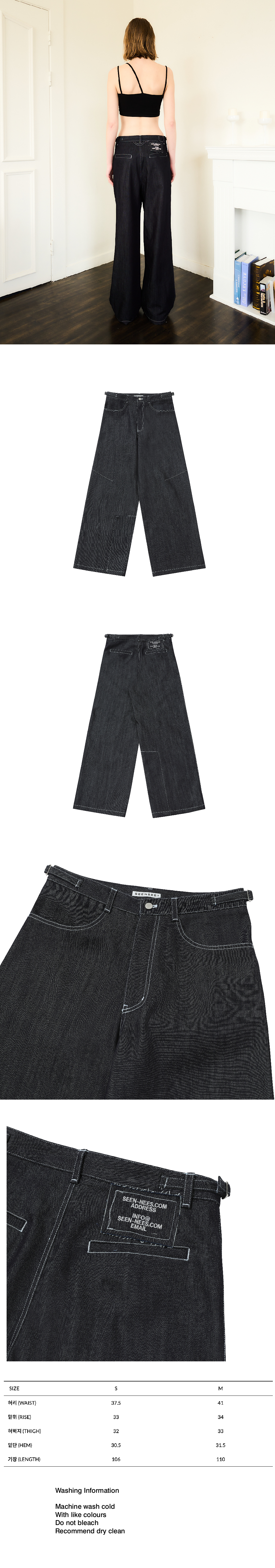 Italy fabric Buckle at waist for adjust Dart detail at knee Pannel on Right leg Logo embroidery label at back Wide fit 이태리 데님원단 양쪽 버클로 사이즈 조절 가능 무릎에 다트 디테일 오른쪽 원단 덧뎀 허리 뒤쪽에 자수 로고 라벨 와이드 핏 Made in South Korea Washing Information Machine wash cold With like colours Do not bleach Recommend dry clean