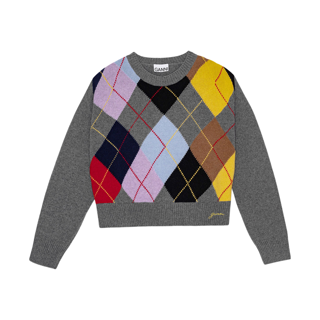 (W) Ganni Harlequin Wool Mix Oversized O-Neck Pullover Frost Gray