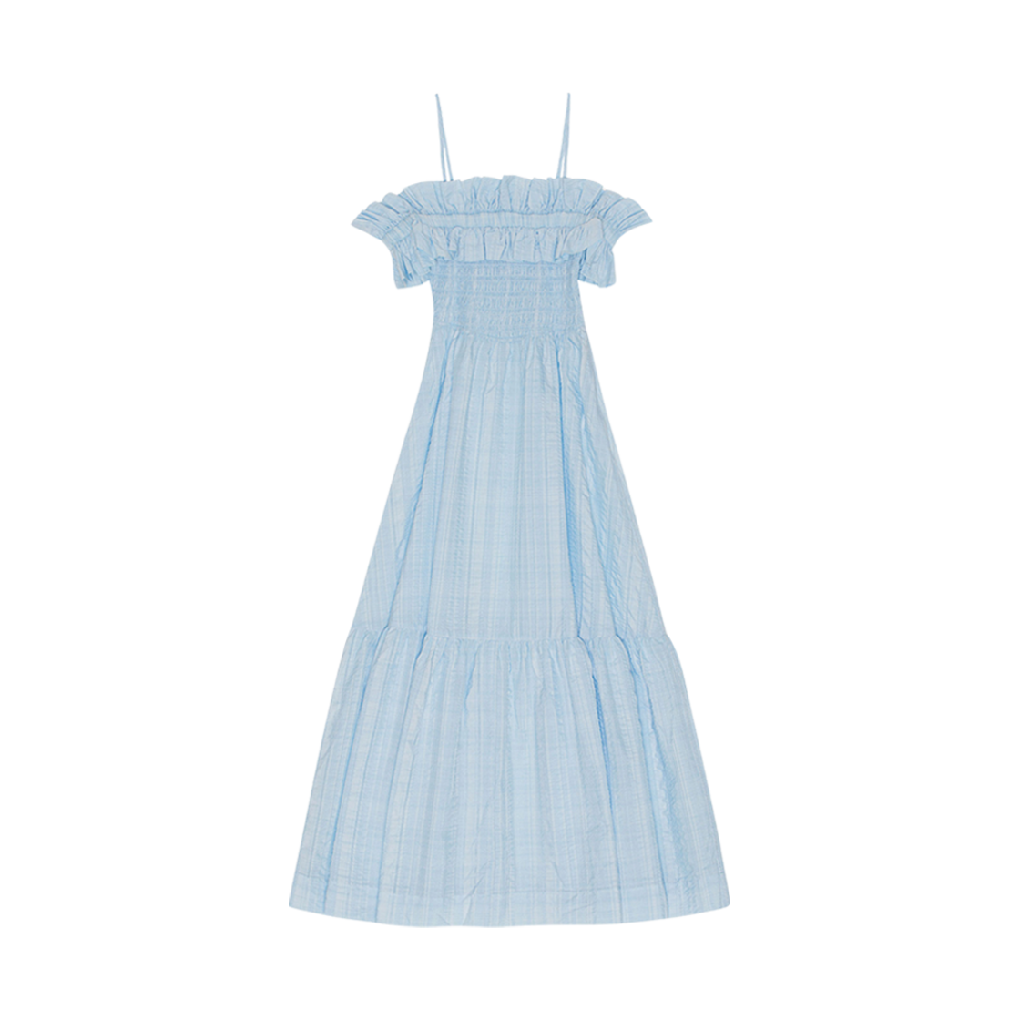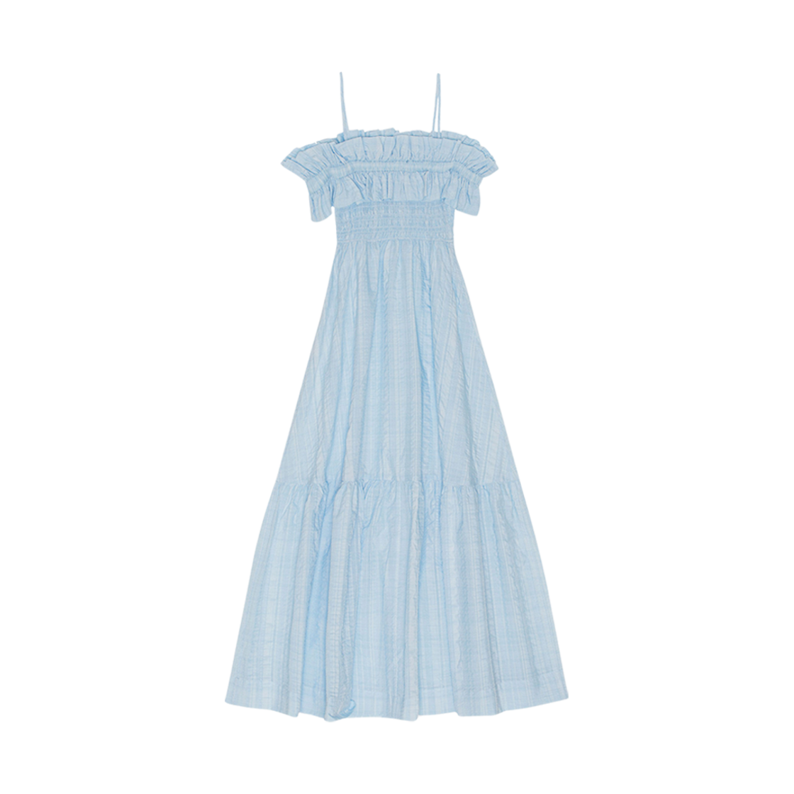 (W) Ganni Seersucker Check Smock Maxi Dress Ice Water