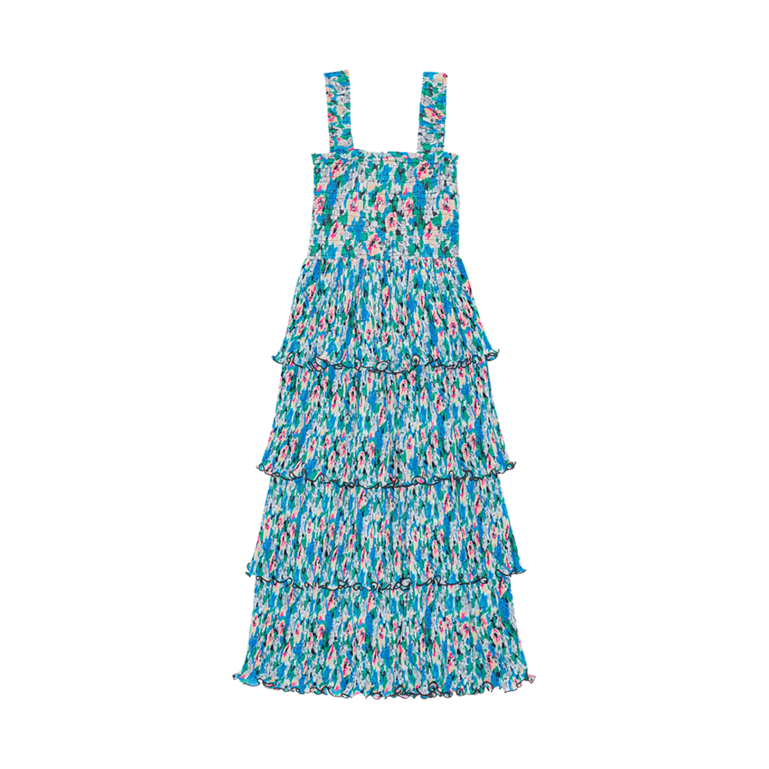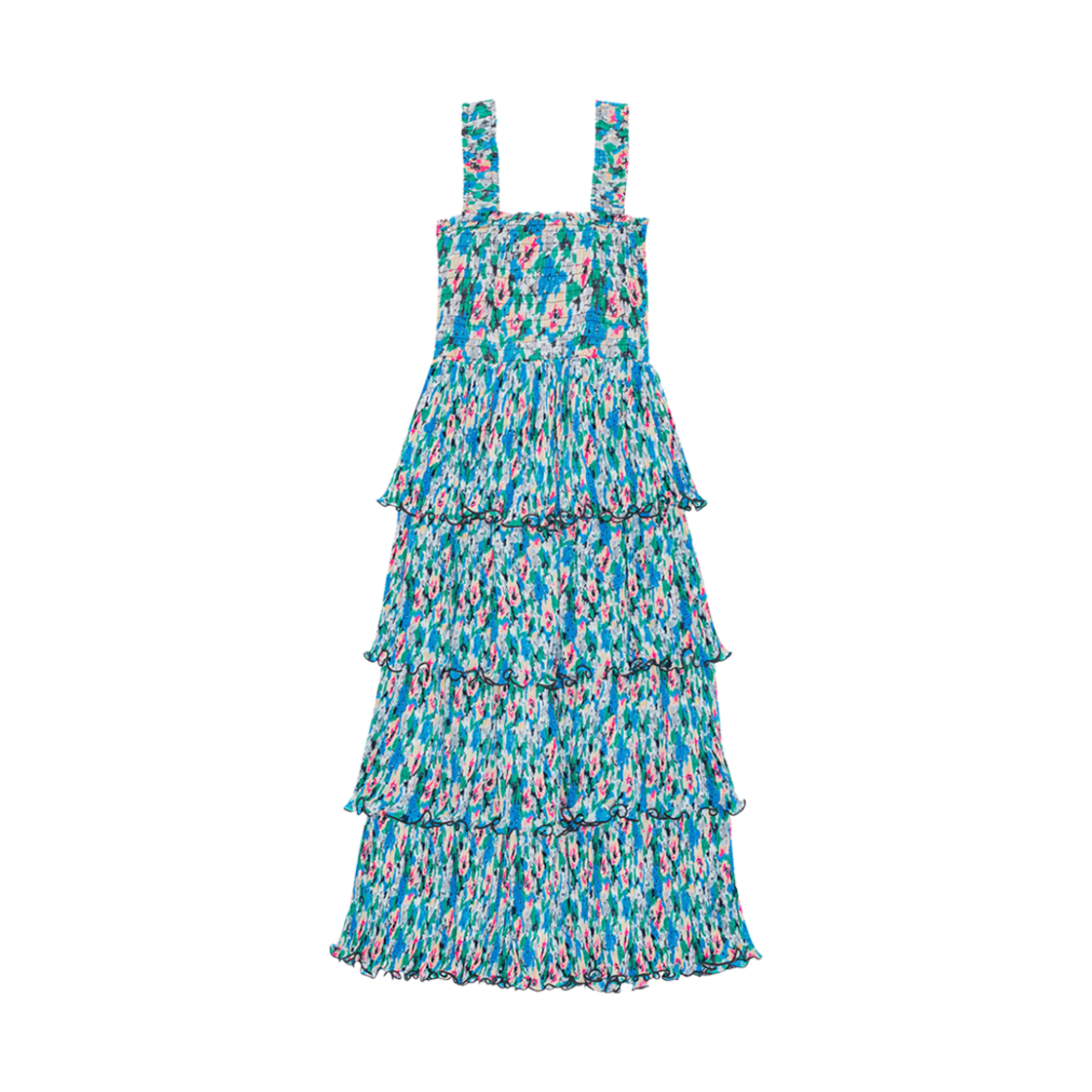 (W) Ganni Pleated Georgette Smock Midi Dress Floral Azure Blue