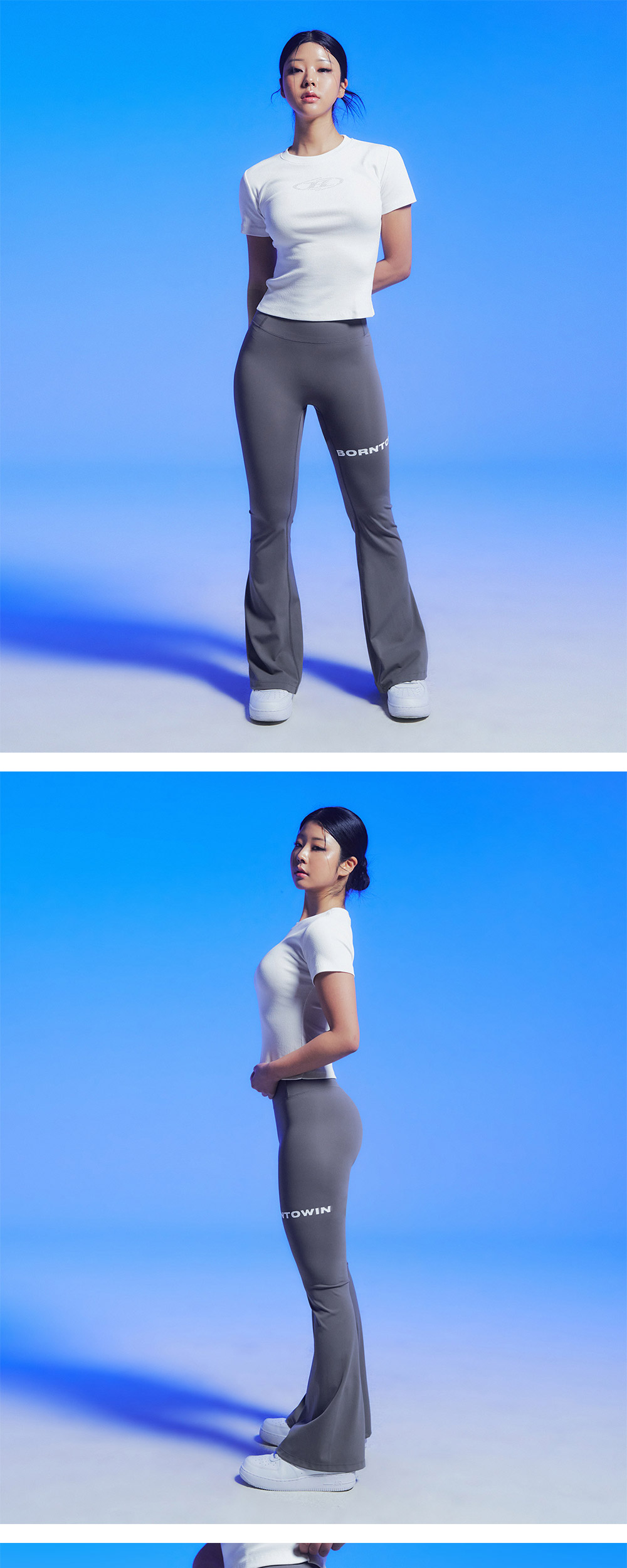 [DETAILS] * 본투윈 라인 부츠컷 레깅스 - 고신축 나일론 하이게이지 원단 - 체형을 보정하는 하트 힙라인 - 전면 레터링 프린팅 - 뒷중심 B 로고 프린팅 - 실루엣 좋은 부츠컷 핏 Material : Nylon 80% Polyurethane 20% Fitting : 1 Size, 165cm, 53kg