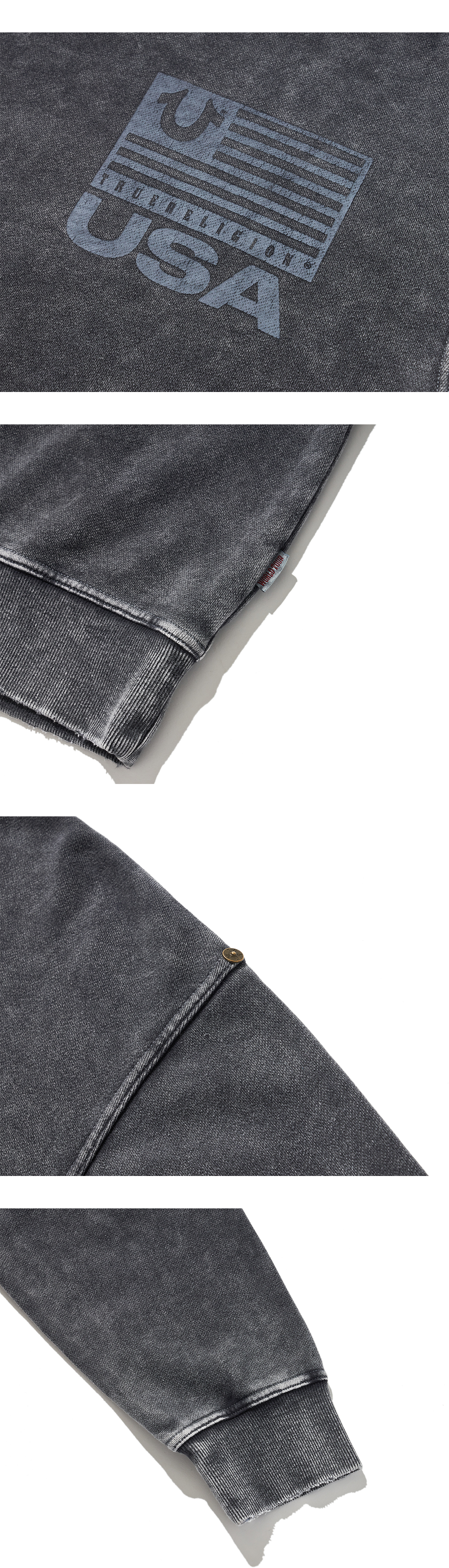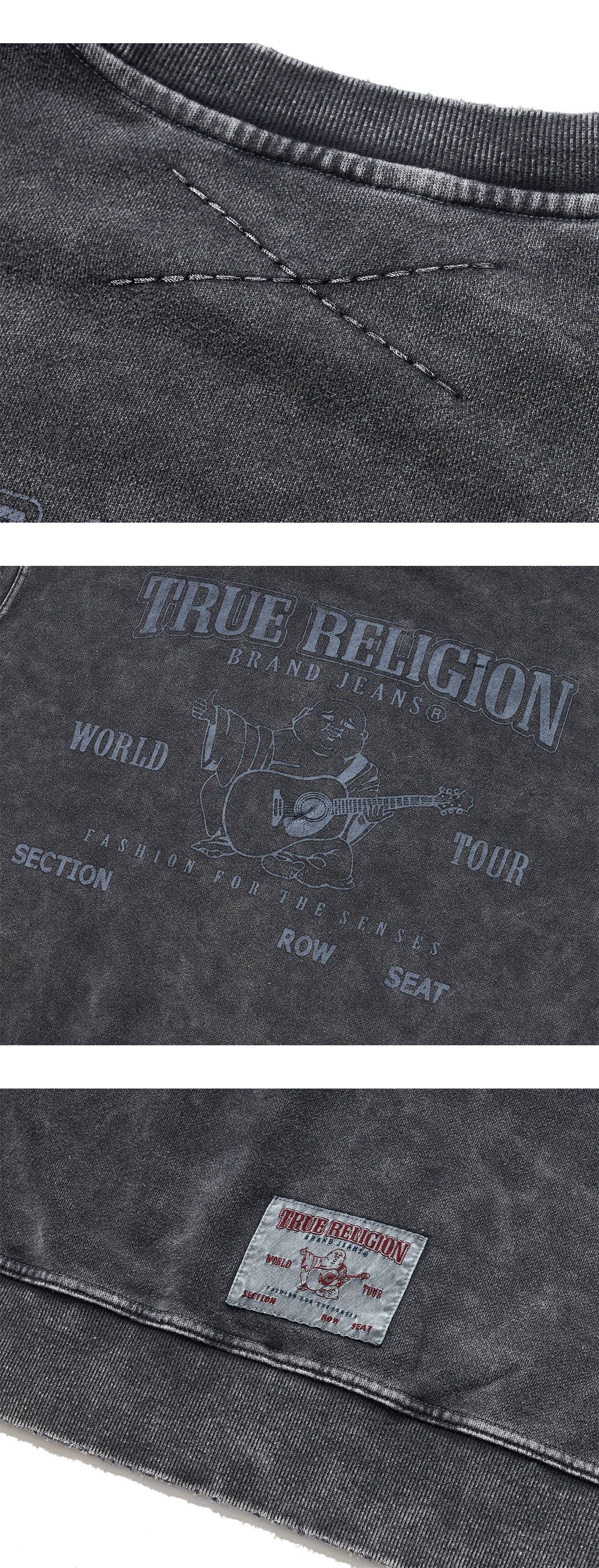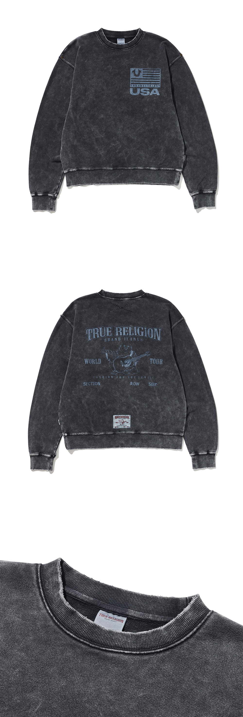 - 빈티지 워싱 맨투맨 - 넥, 소매, 밑단 데미지 디테일 - 양쪽 어깨 TR ORIGINAL 리벳 디테일 - 앞면 트루릴리젼 USA 그래픽 DAMAGED 프린트 - 뒷면 트루릴리젼 O.G 그래픽 DAMAGED 프린트 - 뒷면 트루릴리젼 시그니처 BIG T - X 스티치 - 뒷면 밑단 직조라벨 포인트