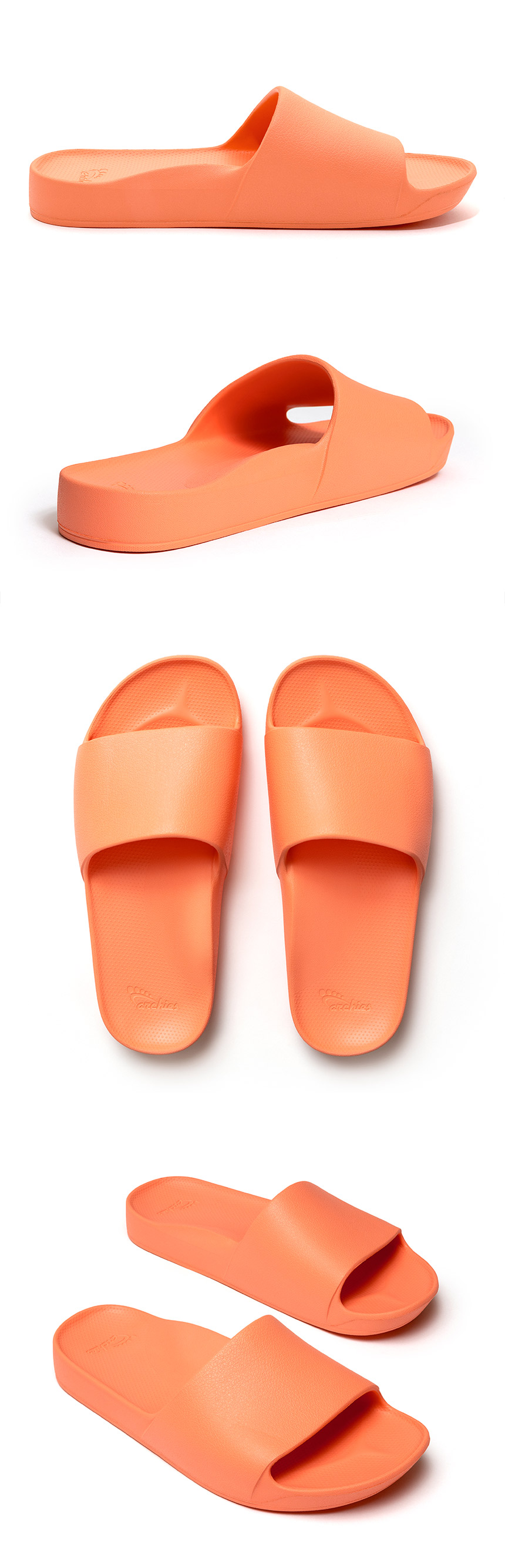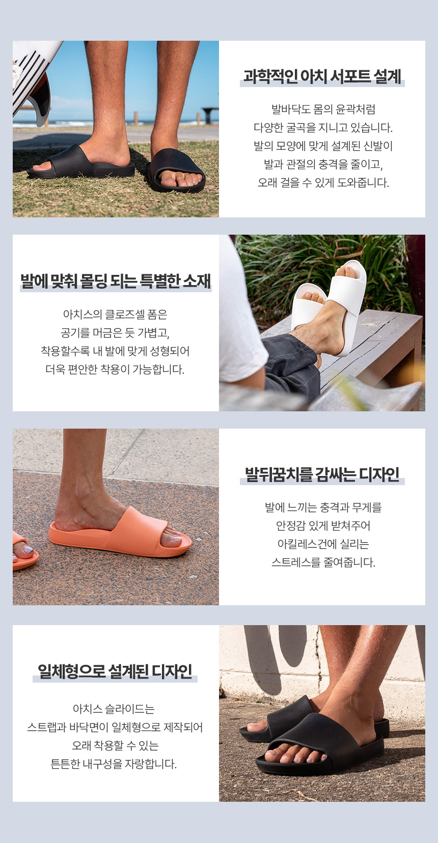 아치스 슬라이드는 리커버리 기능에 초점을 맞춰 부가 디자인적인 요소는 간결하게 설계되었습니다. 발 아치를 받쳐주는 아치스 슬리퍼에 지압 효과는 물론,발의 무너진 밸런스를 바로 잡아주는 효과 까지 경험 하실 수 있습니다.