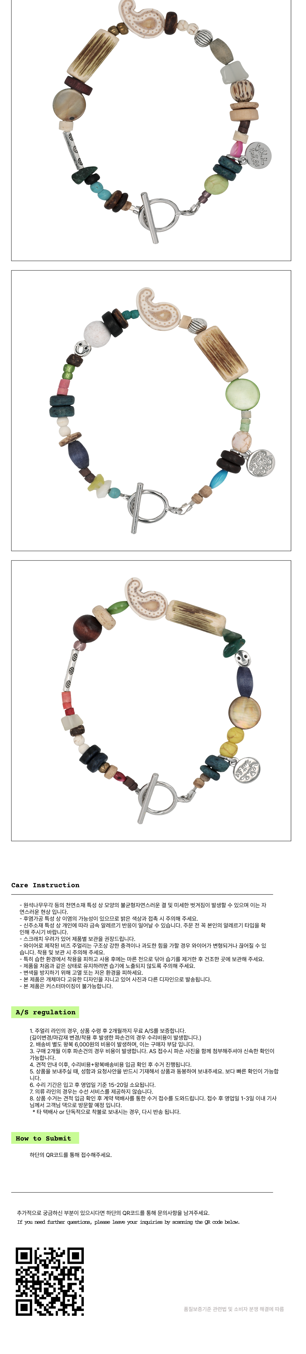 토우토우만의 뚜렷한 색과 감성을 담아 수작업으로 제작되는 팔찌 입니다. 페이즐리 심볼 포인트 참을 중심으로 원석과 비즈 등의 다양한 소재의 조화를 담았습니다. 소재 및 수작업 특성 상 각각의 개체들은 제각기 다른 디자인으로 제작 되기에 구매하시는 모든 분에게 오직 단 하나의 의미로 간직될 특별한 제품 입니다.