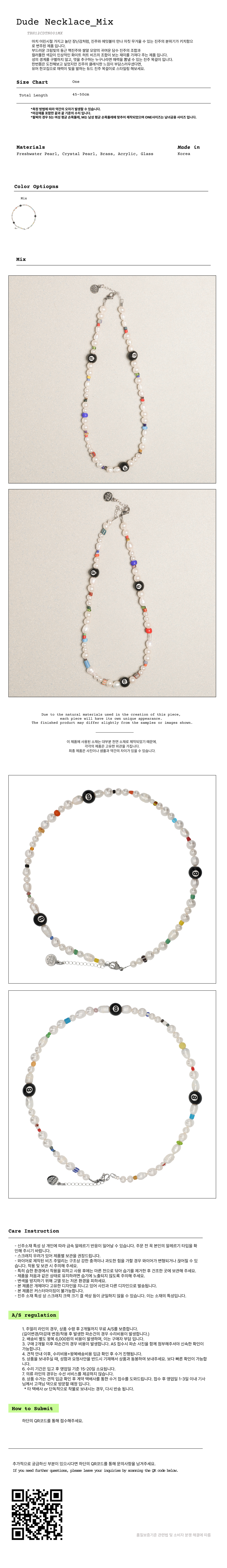 마치 어린시절 가지고 놀던 장난감처럼, 진주와 에잇볼이 만나 자칫 무거울 수 있는 진주의 분위기가 키치함으로 변주된 제품 입니다. 부드러운 크림빛의 둥근 핵진주와 쌀알 모양의 귀여운 담수 진주의 조합과 컬러풀한 색감이 인상적인 화이트 하트 비즈의 조합이 보는 재미를 가져다 주는 제품 입니다. 성의 경계를 구별하지 않고, 멋을 추구하는 누구나라면 매력을 뽐낼 수 있는 젠더리스 쥬얼리 입니다.