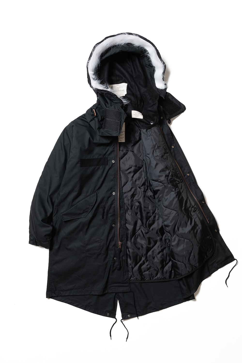 YMCL KY US M-65 Field Parka - Black 본 제품은 오리지널과 동일한 실루엣을 적용 했습니다. 또한 워싱 가공을 거쳐, 자연스러운 감촉이 특징입니다. 후드 및 허리 부분의 스트랩과 손목 버튼으로 사이즈 조절이 가능합니다. 내피는 팔 내부까지 있으며, 내피 및 후드의 탈부착이 가능합니다. 착용시 'S'가 일반적인 남성 '100' 'M'이 '105' 'L'가 '110' 사이즈 정도 입니다.