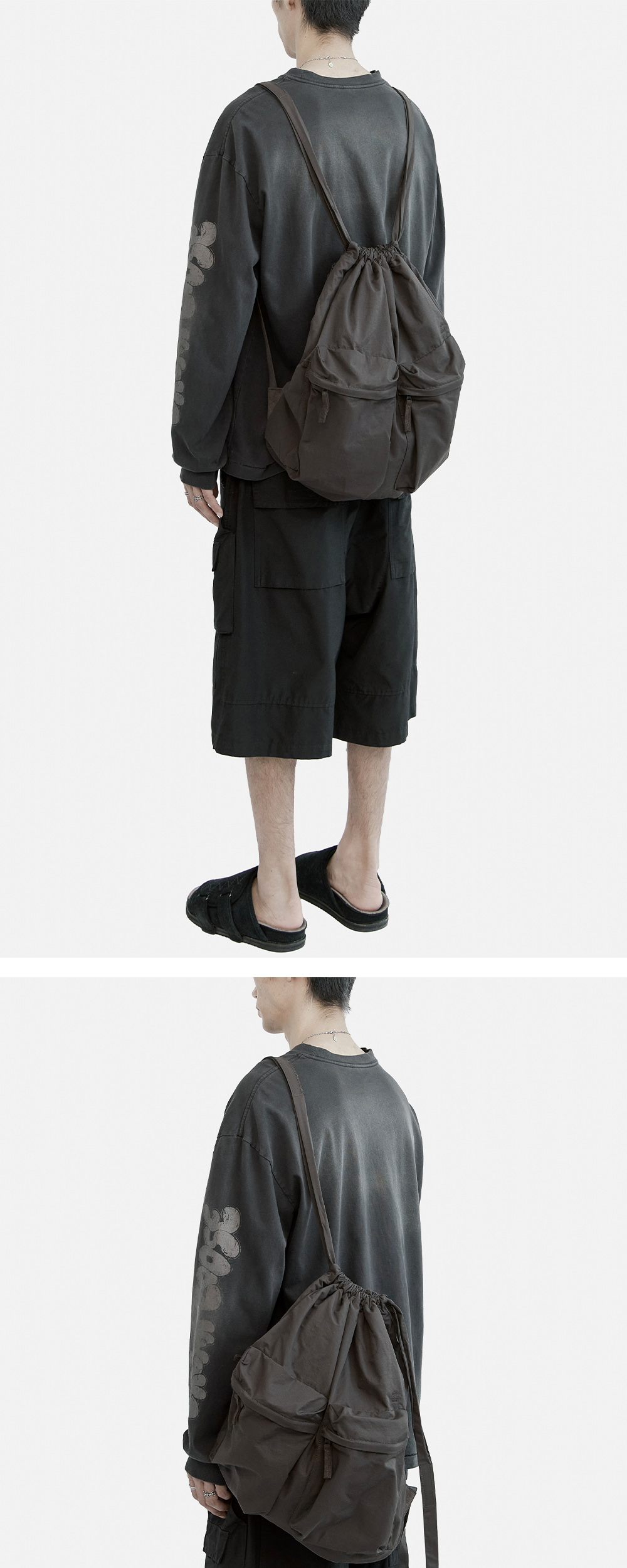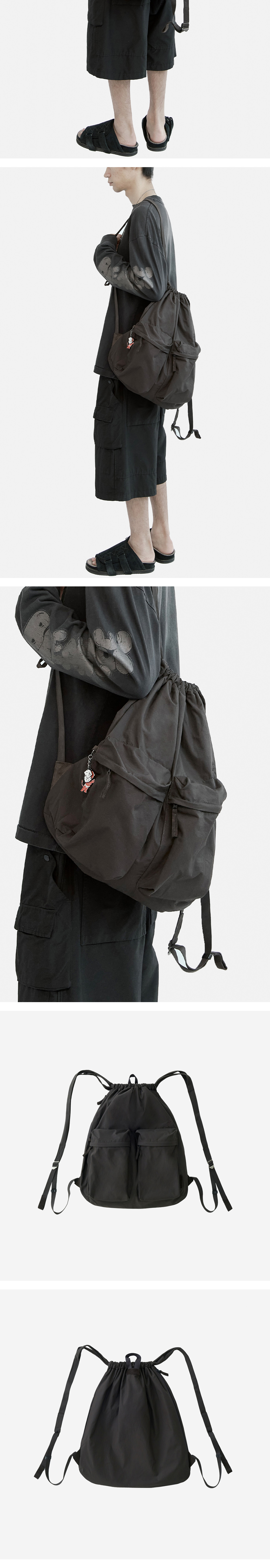 2pk draw bag draw string bag 기반으로 디자인된 드로우백으로 짐색 구조를 베이스로 하여 캐주얼한 외출에 적합하게끔 고안되었습니다. 본 버전은 밀리터리 레퍼런스로 변형한 2개의 포켓 적용, 보다 넉넉한 실루엣과 캐주얼한 분위기를 가지고 있으며, 주말 등 외출 시 주로 가벼운 옷가지와 소지품들, 외부에서 구매하는 이런 저런 물건들을 담아서 걸쳐 매기에 적합합니다. 노트북 또는 두꺼운 아우터 등 수납 가능한 용량이며, 일반적인 구조와 같이 가방 입구를 조이는 스트링을 어깨에 걸어주는 형식이되, 몸판 사이드에 추가 적용된 지퍼를 이용해 편리하게 수납할 수 있습니다. 속심지와 충전재 적용되어 가볍고 푹신한 물성입니다. 양쪽 어깨 걸쳐 맬 시 끈을 조금 짧게 조절, 한쪽 어깨 걸쳐 맬 시 끈을 조금 길게 풀어주시면 좋습니다. *모델: 170 중반 / 마른 체형