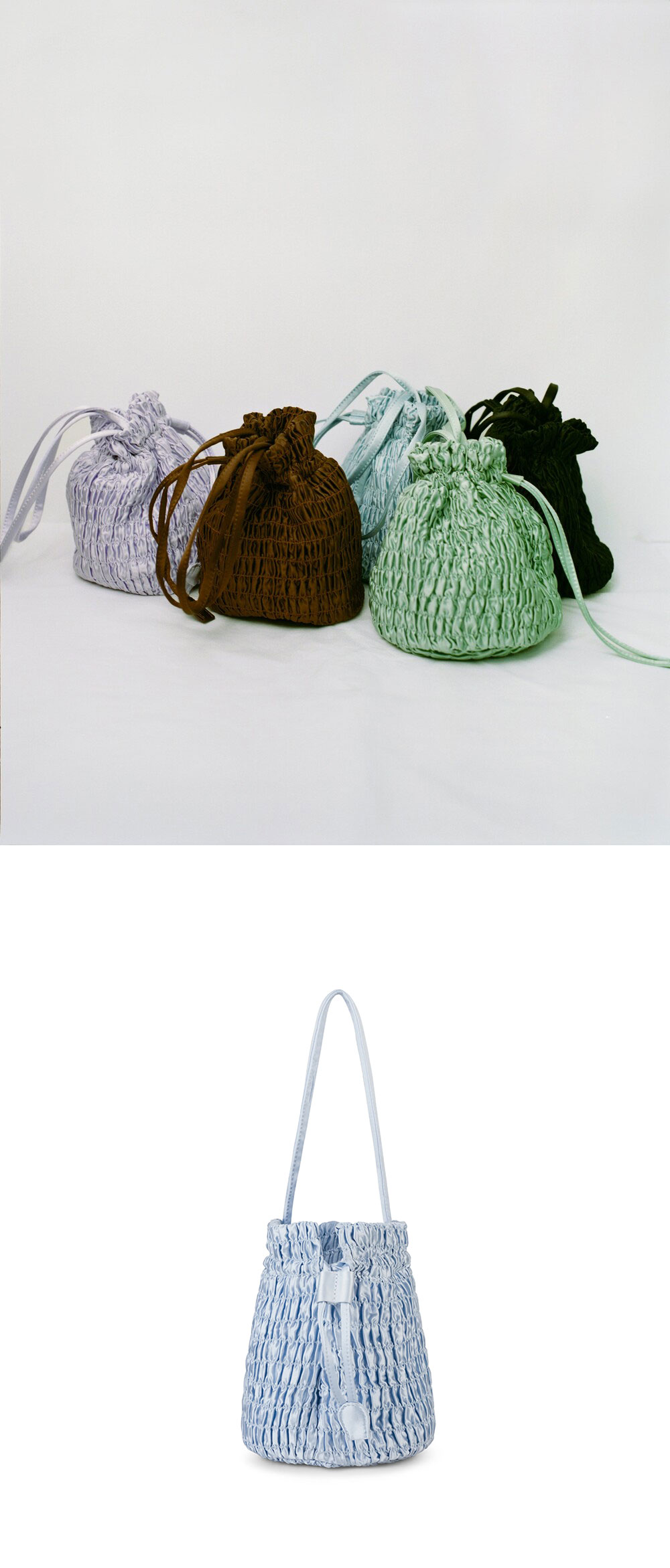 실크 플리츠 원단으로 만들어진 스트링 버킷백 Puff GIna Bag을 소개합니다. 어떤 아이템과 매치하느냐에 따라 캐주얼하게도 드레시하게도 연출이 가능한 아이템입니다. 가볍게 숄더로도 착용하실 수 있습니다.