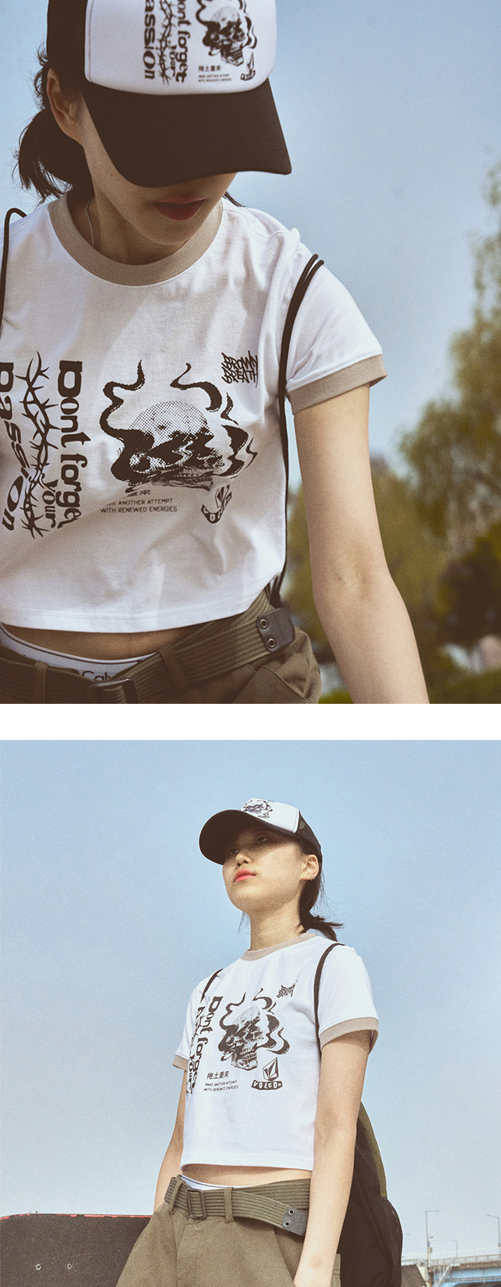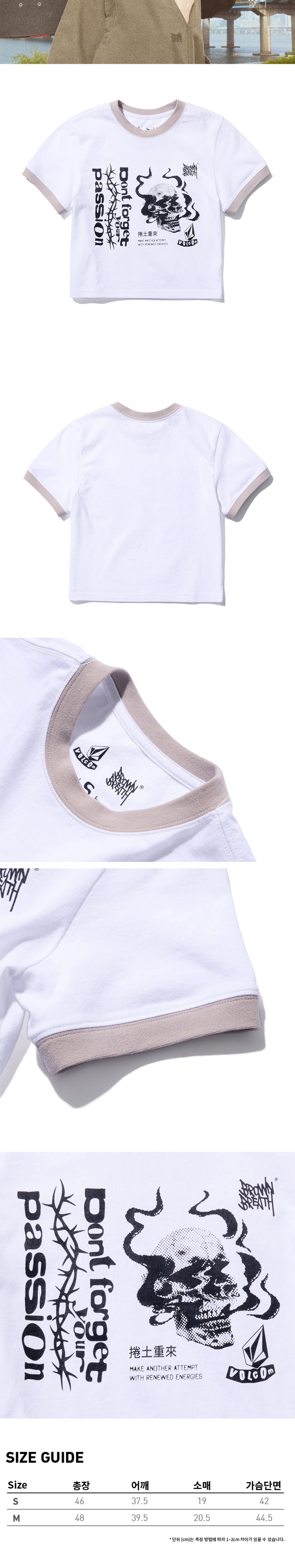 20수 싱글 면 100% 소재 원단 수축 최소화를 위해 덴타, 덤블, 바이오 가공 넥라인 늘어남 방지를 위한 테이핑 처리 볼컴과 브라운브레스의 협업 그래픽 프린팅 크롭 기장의 티셔츠