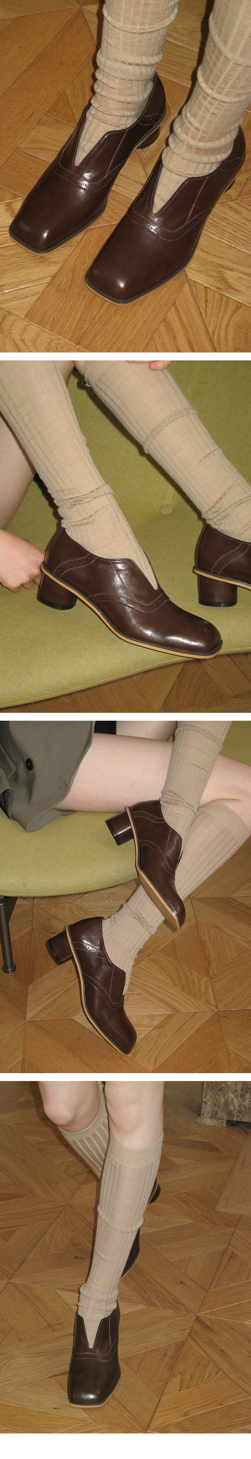 사선 샌딩이 돋보이는 감각적인 쉐입의 글로브 타입 로퍼. V컷 슬릿으로 발 전체를 부드럽게 감싸며 슬림한 시각효과를 가진 아이템. 슈즈 라인을 따라 정교한 펀칭 디테일로 마무리.