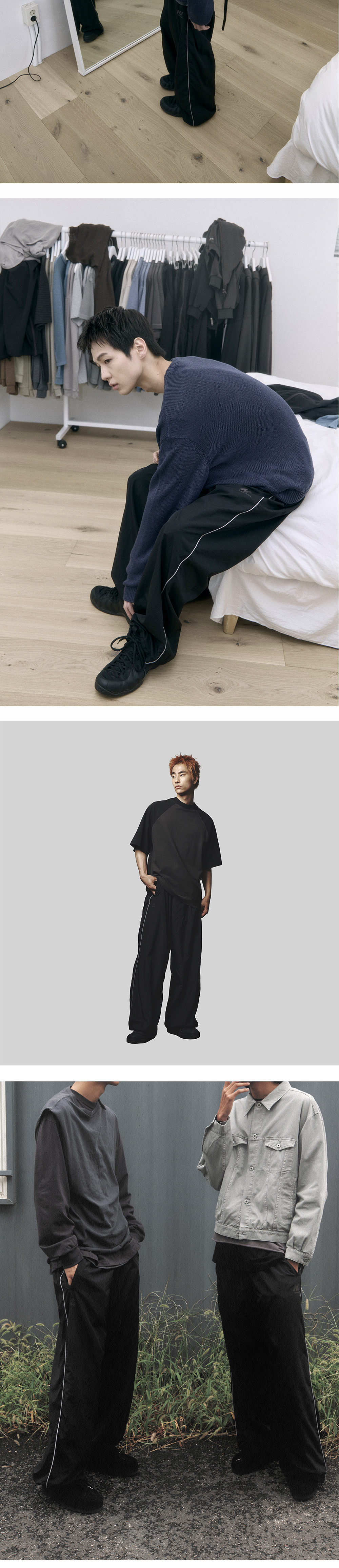 index track pants * 내추럴한 질감의 워시드 나일론 트랙 팬츠 * 자연스럽게 떨어지는 루즈한 실루엣 * 밴딩 웨이스트 * 쾌적한 착용감과 안정 된 실루엣을 유지해주는 메시 안감 * 사이드의 배색 파이프드 라인 * 조절 가능한 허리와 밑단의 엘라스틱 스트링 1 - 5 size 각 사이즈 160중반 / 170초반 / 170중반 / 180초반 / 180중반 착용시 적당히 넉넉한 실루엣으로 착용할 수 있습니다. * 기호에 따라 사이즈 선택 가능