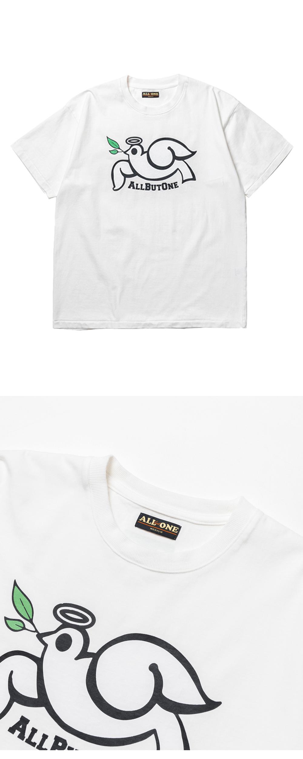 ABO Dove T-Shirt White 에이비오 도브 티셔츠 화이트 ABO의 시그니처 아트워크가 돋보이는 반팔 티셔츠 30수 2합의 두께감 있는 코튼 소재 사용 소매, 밑단 싱글 스티치 마감 디테일 어깨 부분 체인 스티치 마감 후면부 상단에 브랜드 네임 로고 프린팅 디자인