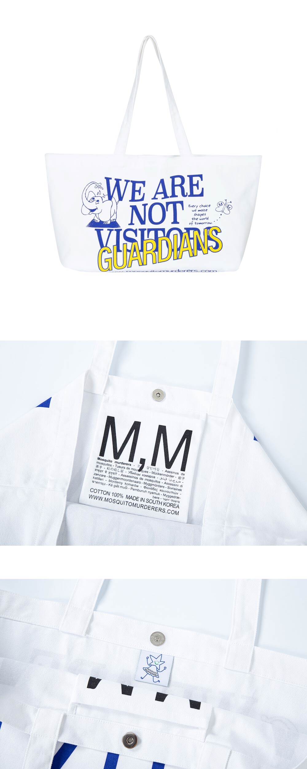 - 탄탄한 100% 면 캔버스 텍스처 - 내부 포켓과 마그넷 오픈 클로징 - 벗겨지거나 바래지 않는 선명한 프린팅 Mosquito murderers의 모든 의류는 한땀 한땀 사람의 손으로 탄생됩니다. 세탁시 케어라벨을 확인해 주시고, 프린팅의 손상을 최소화 하기 위해 뒤집어 세탁하는 것을 권장합니다.