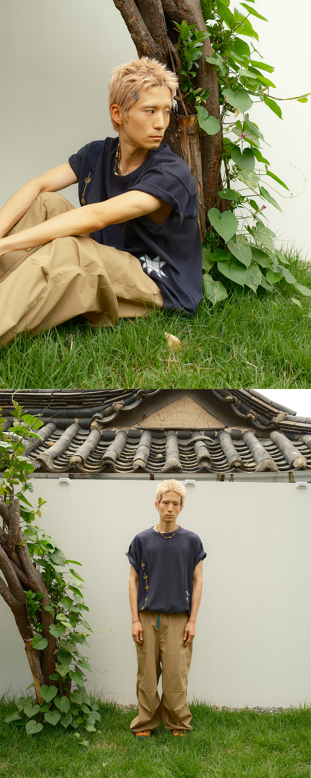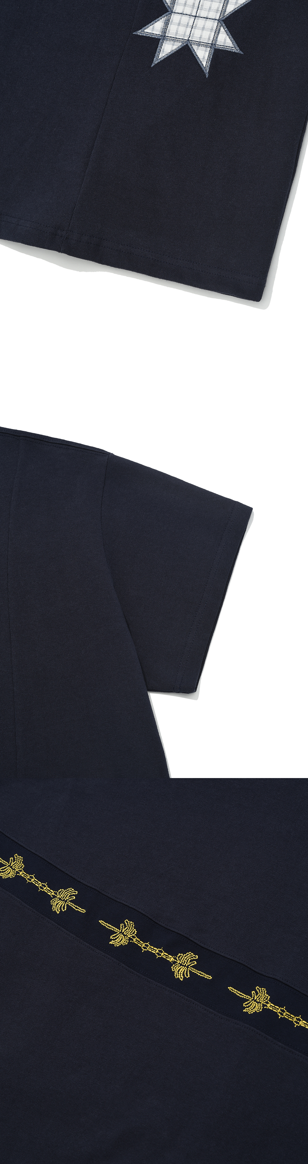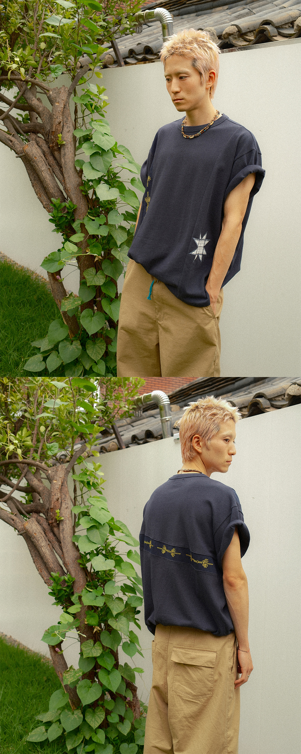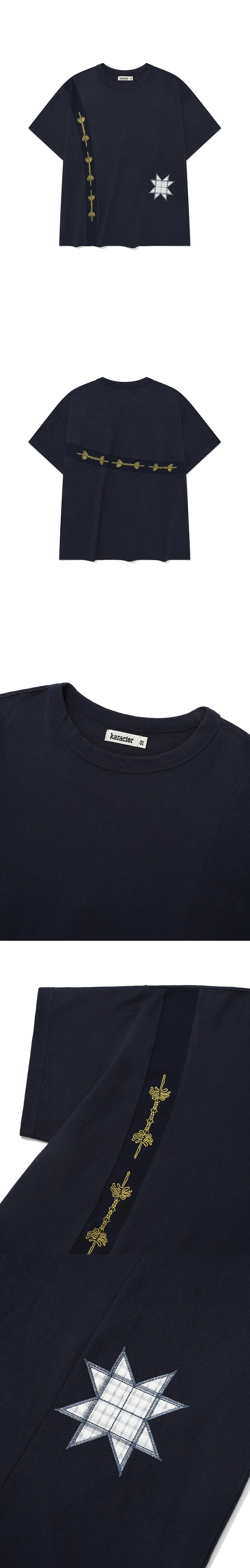 Product Info. - 탄탄한 텍스처의 밀도 높은 10수 패브릭 - 빈티지한 컬러감의 반팔 티셔츠 - 오버사이즈드 핏으로 편안하고 여유로운 착용감 - 곡선 구조로 은은하게 배색 된 전/후면 패널 디자인 - 야자수 모티브의 스티치 자수 포인트 - 전면 좌측 빈티지 무드의 패치워크 자수 포인트