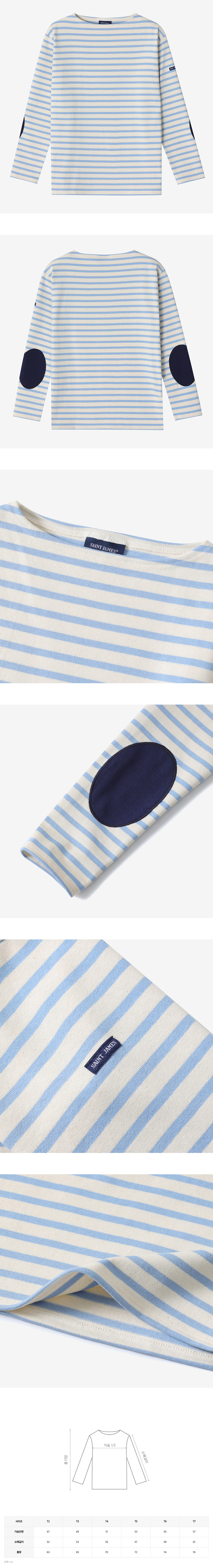 도톰하면서 내추럴한 면 소재 제품. GUILDO 스트라이프 제품에 배색 컬러의 팔꿈치 패치가 덧대어 있다. 왼쪽 팔에 세인트 제임스 로고 패치가 붙어 있다.