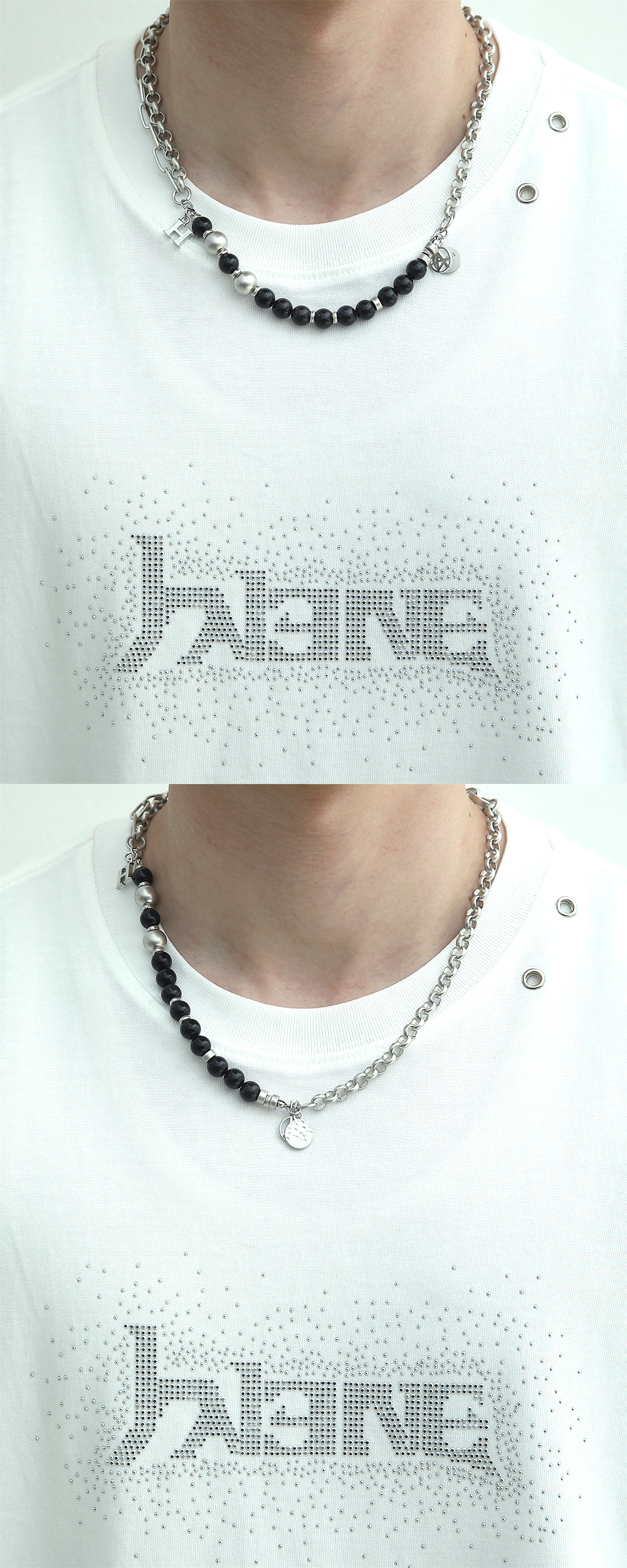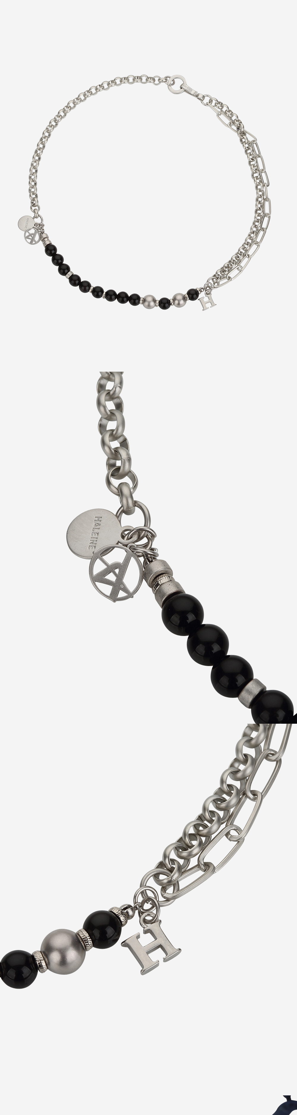 천연 원석과 메탈 체인들을 레이어드하여 유니크한 디자인을 연출한 목걸이입니다. 원석과 메탈이 적절히 믹스되어 있어 착용 위치에 따라 다양한 연출이 가능한 제품입니다. - DEATIL - 메탈 로고 참 비대칭 레어이드 디자인