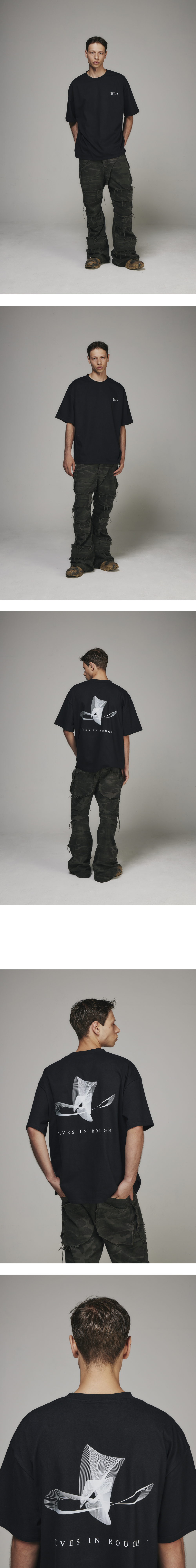 활동성이 강한 오버핏 티셔츠 전면부 BLR 폰트 프린팅 후면부 BLR 스핀 로고 프린팅 포인트 덤블 가공된 원단으로 우수한 터치감 활용도 높은 컬러감