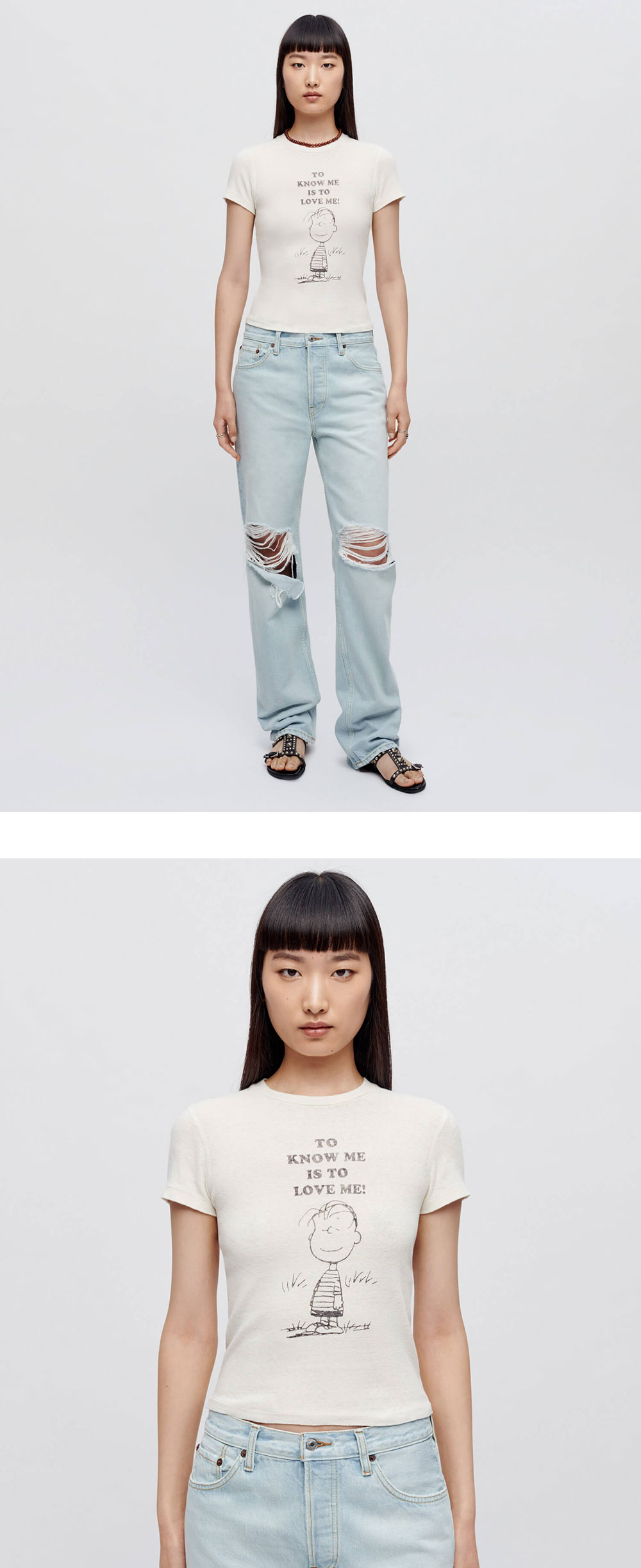 가장 사랑하는 빈티지 티셔츠에서 영감을 받은 리던의 베이비 티셔츠입니다. - 스누피 라이너스 캐릭터와 레터링 그래픽 - 숏슬리브 크루넥 티셔츠 - 크롭 핏 | 사이즈 가이드 | - 착용 사이즈: S