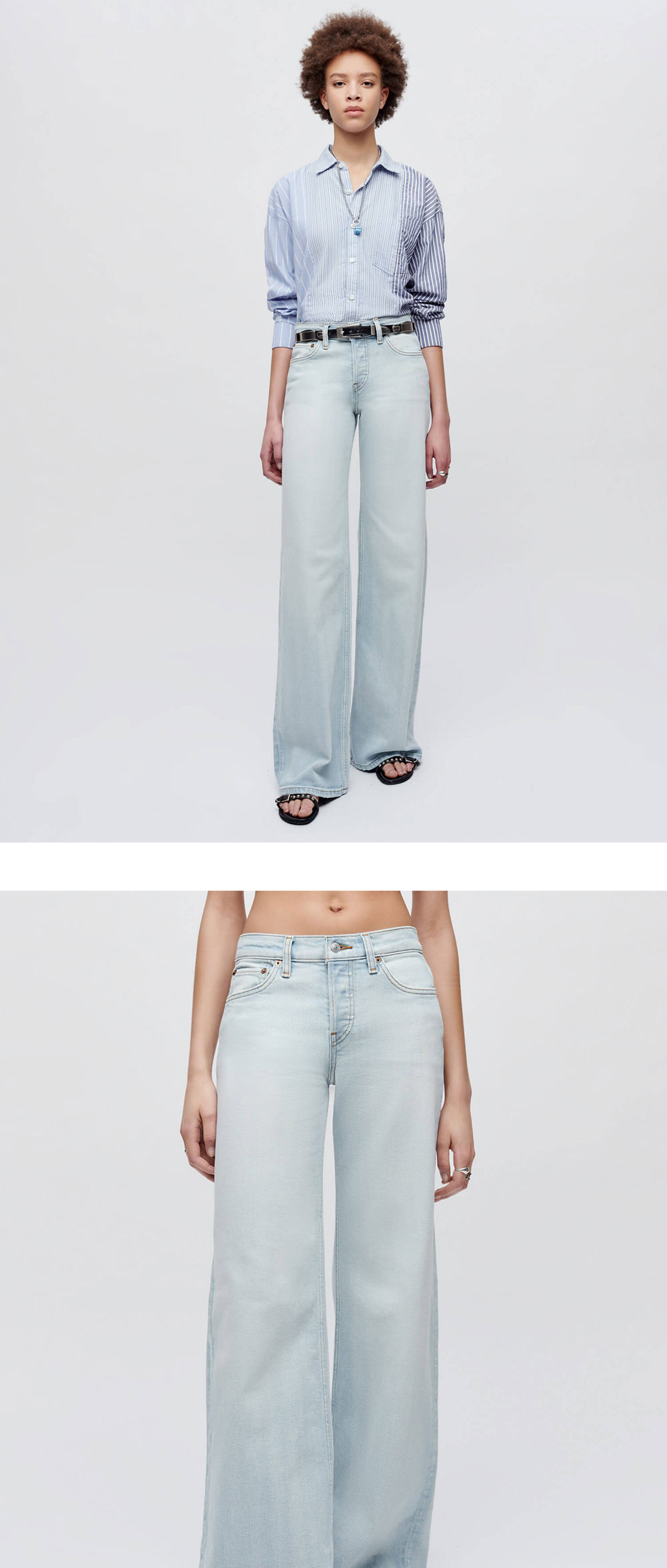 리던의 베스트셀러 70s 울트라 하이 라이즈 와이드 레그를 미드 라이즈로 재해석한 데님 팬츠입니다. - 가벼운 빈티지 워싱의 에코-스트레치 데님 - 클래식 버튼 플라이 | 사이즈 가이드 | - 착용 사이즈: 25