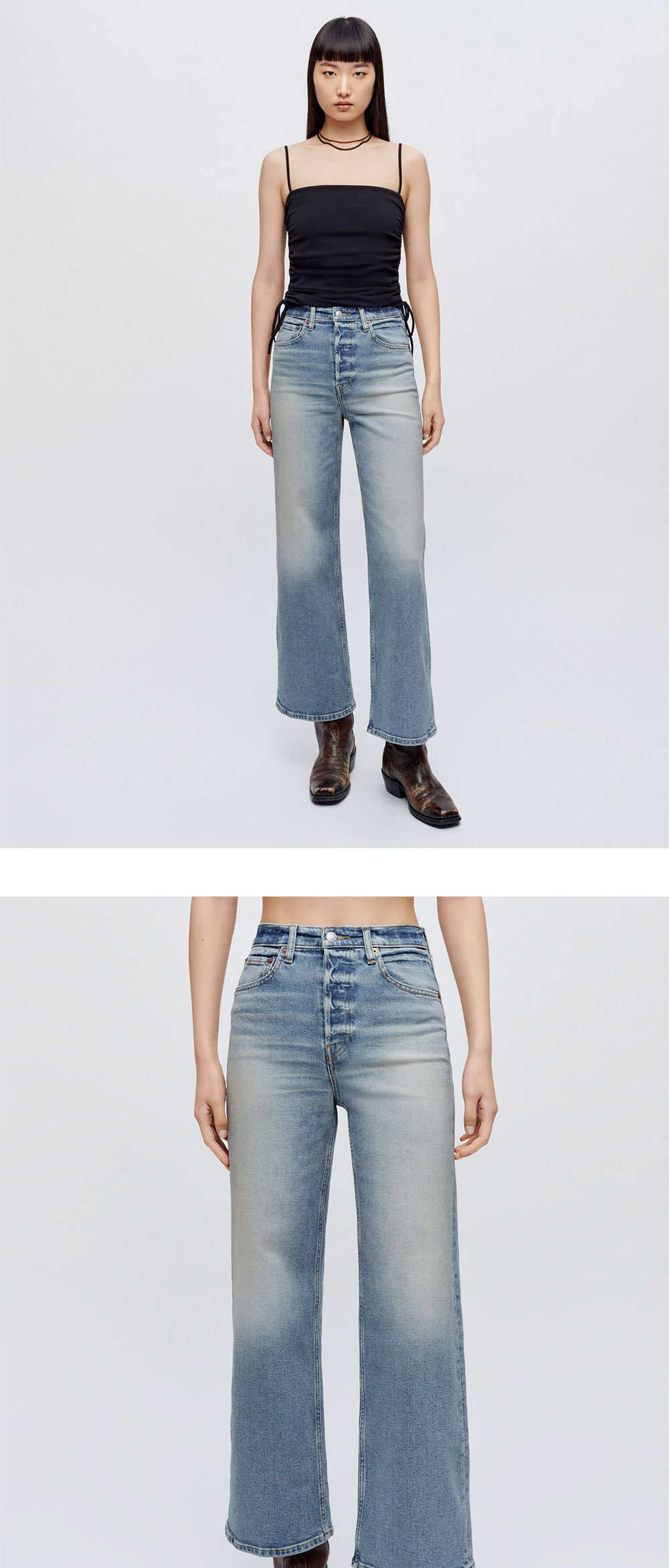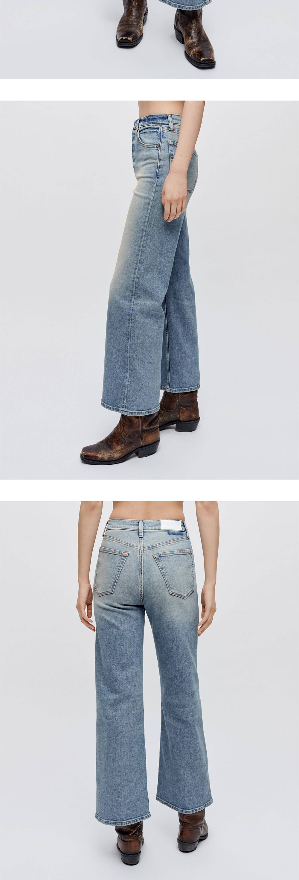 하이라이즈 핏과 워싱 디테일이 특징인 리던의 와이드 레그 크롭 진 벨라로사 색상입니다. - 크롭한 기장 - 클래식 버튼 플라이 - 허벅지 전면 및 후면에 전체적인 워싱 디테일 | 사이즈 가이드 | - 착용 사이즈: 25