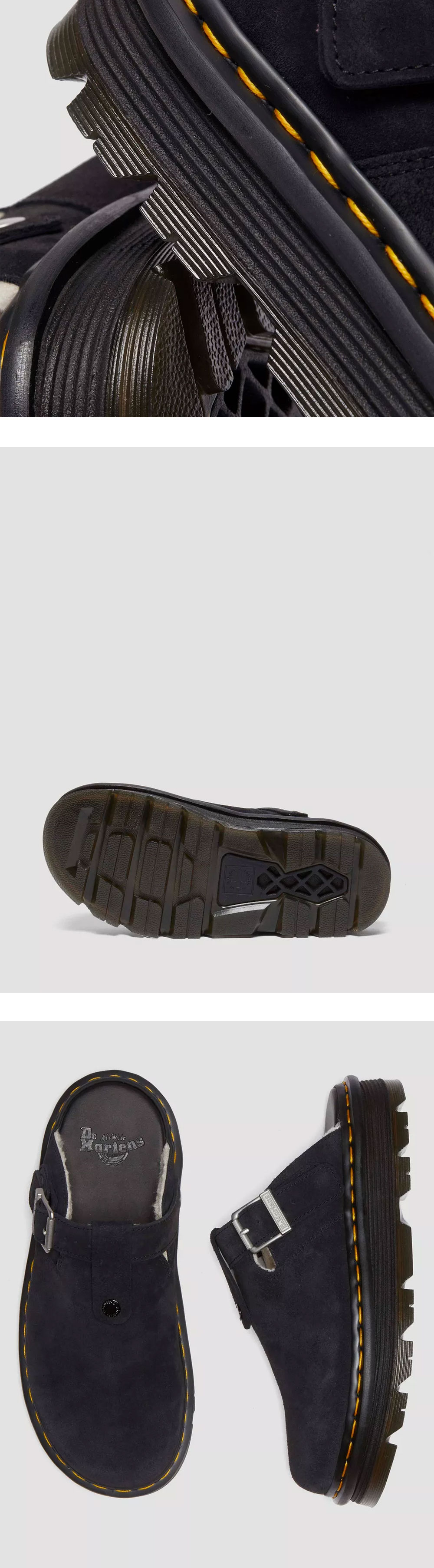 캐주얼한 실루엣과 스웨이드 특유의 질감이 더해진 닥터마틴의 제브잭 스웨이드 슬링백 플랫폼 뮬 블랙입니다. - 따듯한 플리스 안감 - 조절 가능한 발등 스트랩 - 넓고 둥근 발모양의 풋베드