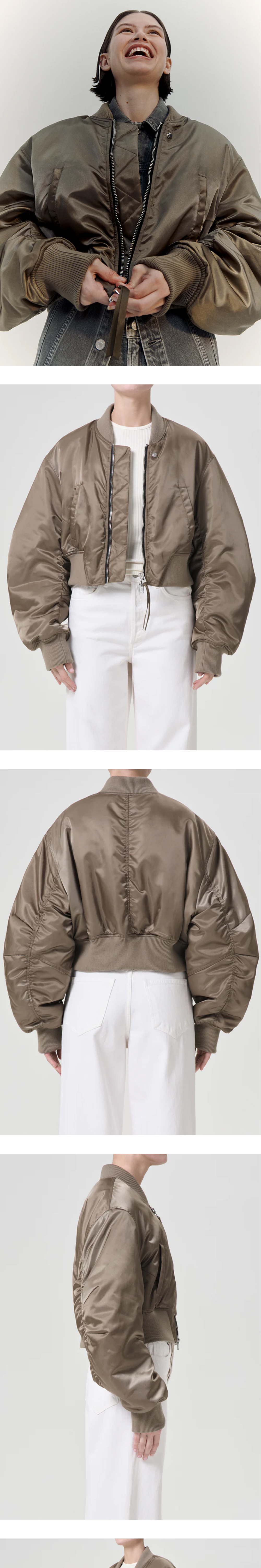 크롭 기장과 곡선의 소매 실루엣으로 우아한 느낌을 주는 에이골디의 봄버 자켓입니다. - 릴랙스 핏 - 드롭 숄더 디자인 - 두껍지 않은 내부 퀼팅 - 소매 및 후면 셔링 디테일 - 매우 부드러운 소재의 립