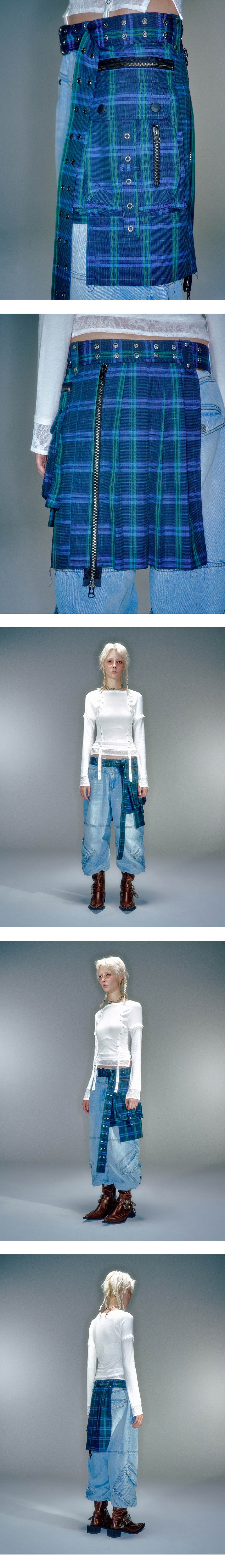베이컨트 아카이브 바제스 레이어드 스커트 벨트 체크 블루