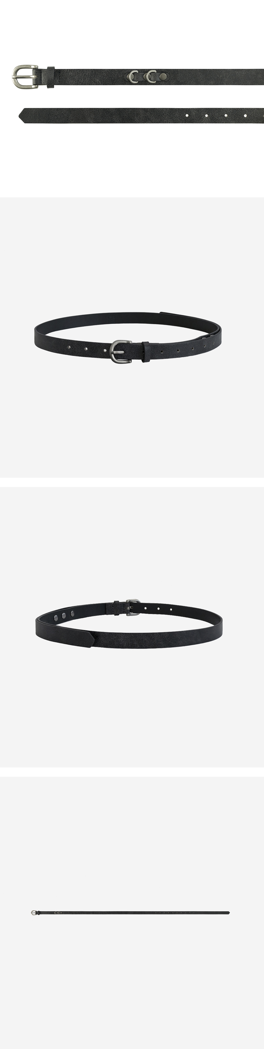 leather belt 001 plain - black 넉넉한 길이감의 레더 벨트. 티셔츠 아래로 키링을 레이어링 할 수 있는 사이드 디테일이 있습니다. 빈티지한 질감이 강조되는 천연 소가죽 사용. 플레인 및 젬스톤 타입으로 구성. - 총길이 119cm, 폭 2cm - 허리둘레 29~38인치 조절 가능 *모델: 170 중반 / 마른 체형