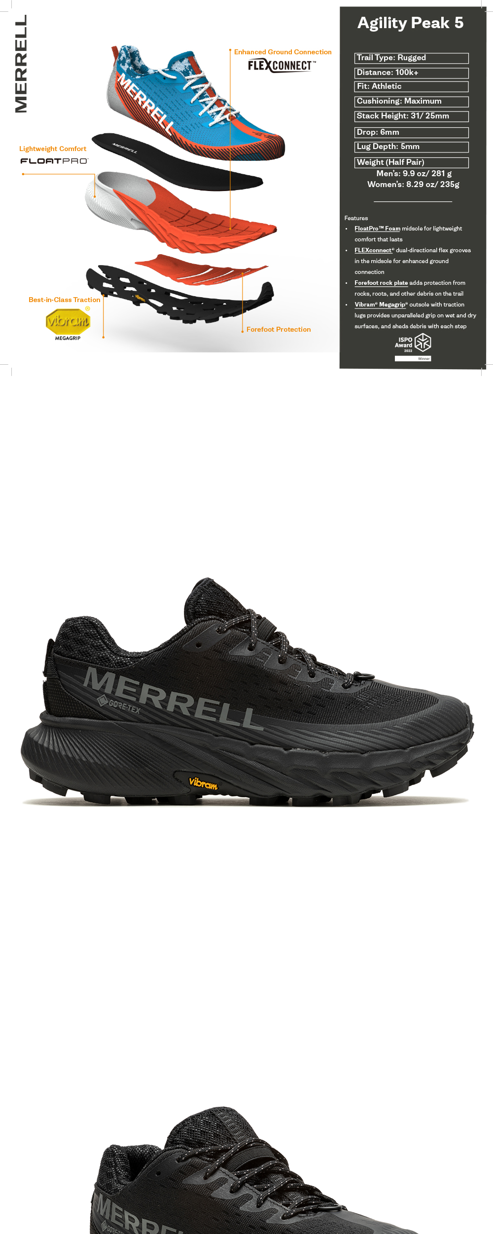 국제 최대 규모의 아웃도어 박람회, ISPO 2022 AWARD를 수상한 머렐의 트레일 러닝 슈즈입니다. - GORE-TEX: 뛰어난 통기성과 방수 기능 - 통기성 엔지니어드 메쉬 및 TPU 어퍼 - 게이터 D-Ring - Cleansports NXT: 생분해 기술로 악취 제어 - Flexconnect: 양방향으로 유연한 소재의 미드솔로 뛰어난 접지력 제공 - FloatPro: 오랫동안 발을 편안하게 해주는 경량 미드솔 - Vibram MegaGrip: 젖은 지형에서도 최상의 마찰력을 제공하는 고성능 아웃솔 - Vibram Traction Lug: 마찰력 보강 * 정사이즈 착용 권장