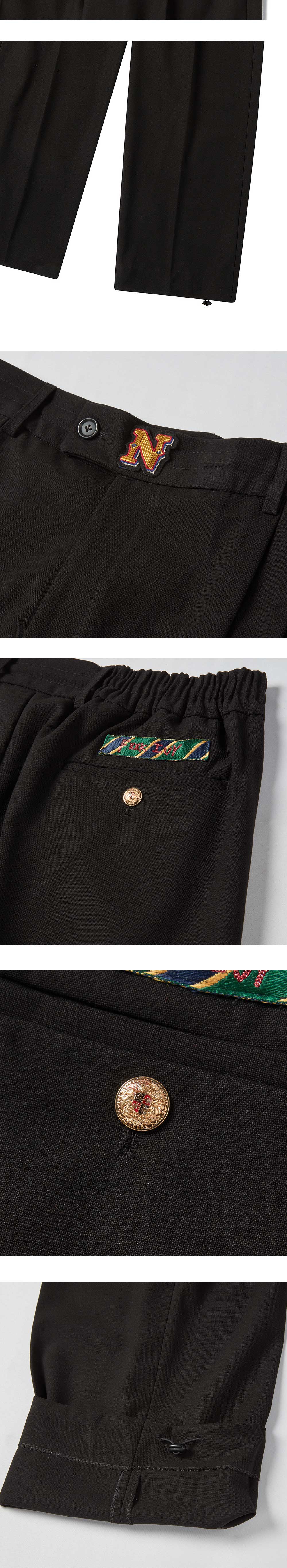 ㆍ컬렉션 라인의 울 혼방 소재로 제작된 프레피 룩 디테일의 슬랙스 ㆍ빈티지 레이스 스트링과 엘라스틱 밴드를 통한 허리 사이즈 조절 가능 ㆍ울과 레이온, 폴리로 혼방된 소재를 통해 묵직하고 견고한 핏의 슬랙스를 완성 ㆍ안쪽 시접 처리를 프레피 무드의 원단으로 감싸 마감한 고급 디테일 ㆍ핸드메이드 방식으로 제작된 파키스탄 공방의 와팬으로 포인트 ㆍ일본에서 제작된 레지멘탈 테이프 포인트와 금장 버튼 등 곳곳의 디테일 ㆍ밑단의 엘라스틱 스트링을 통해 다양한 핏으로 착용 가능 ㆍYKK 지퍼 사용 ㆍ남녀공용 착용