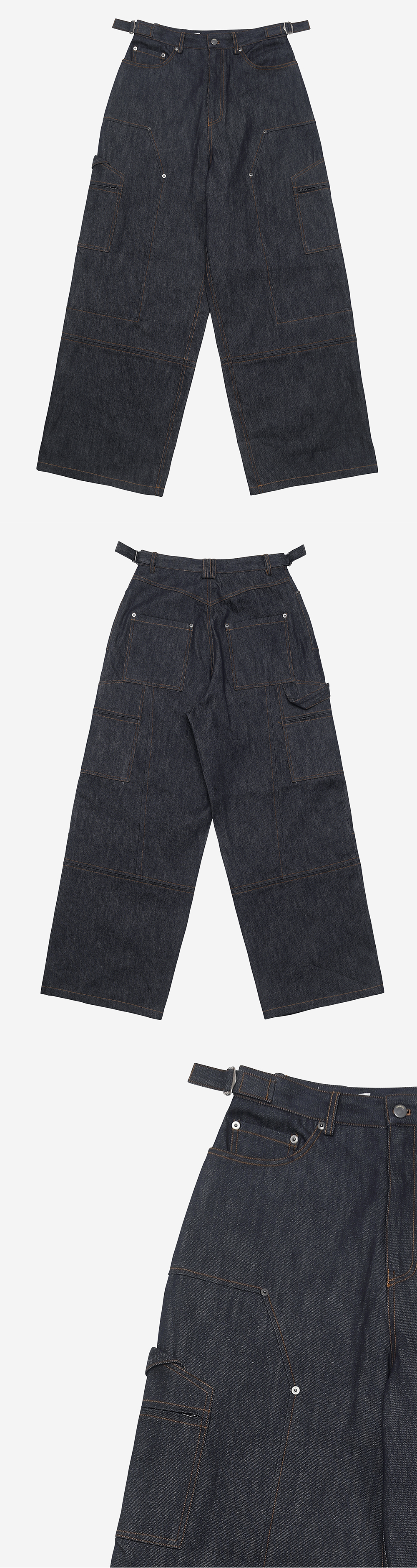 카고 팬츠와 카펜더 팬츠의 디테일을 믹스하여 유니크한 디자인으로 재해석한 데님 팬츠입니다. 생지 데님에 옐로우 스티치를 사용하여 경쾌하면서도 캐주얼한 무드를 연출합니다. 와이드 한 실루엣으로 편하게 포인트로 스타일링하기 좋은 제품입니다. -DETAIL- 카고 포켓이 추가된 카펜터 절개 허리 양 사이드 조절이 가능한 벨티드 디테일 입체적으로 설계한 절개 라인 리벳 디테일 -model-_x000B_ 176cm 1사이즈 착용