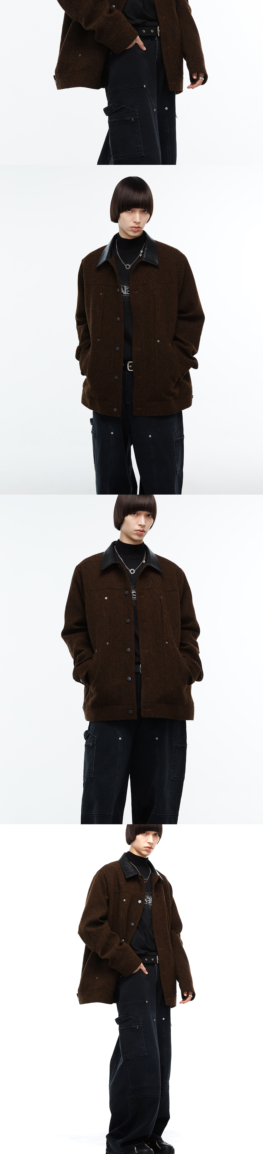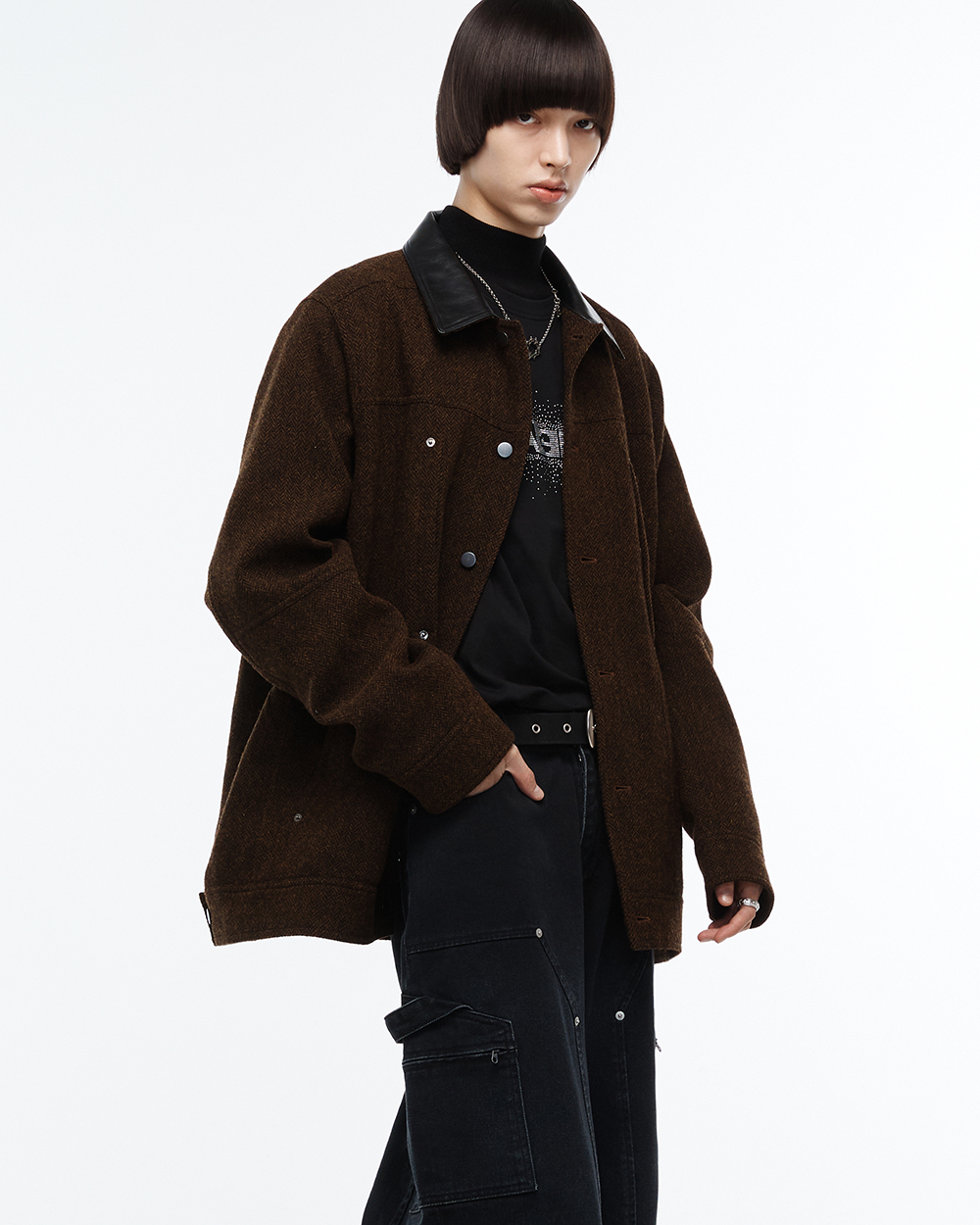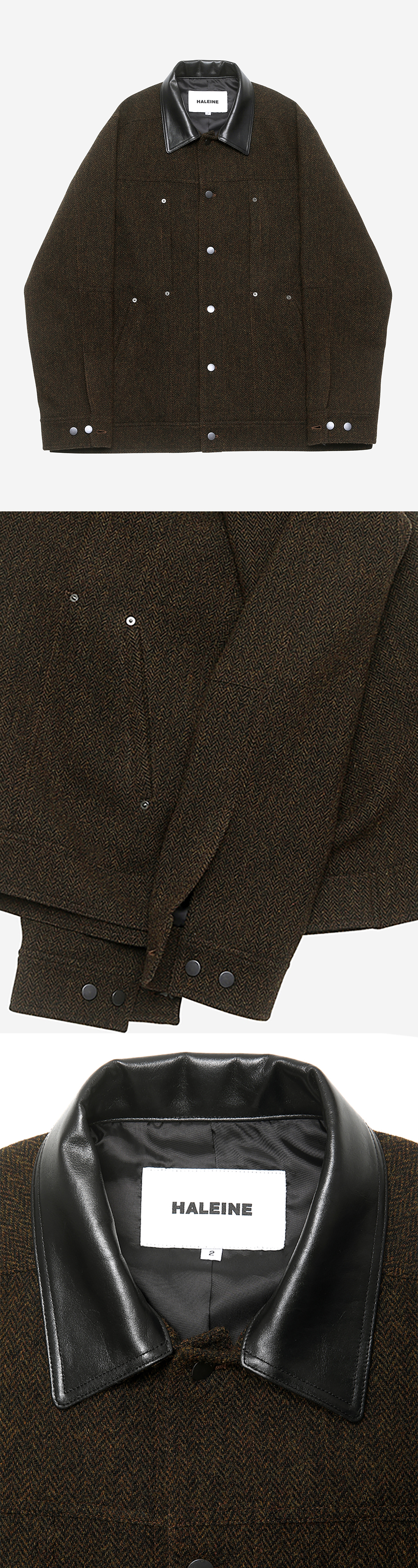 하프 기장으로 제작된 울 워크 자켓입니다. 유니크한 컬러감의 울 해링본 소재(FABRIC BY JAPAN)를 사용하였으며, 칼라 부위에 리얼 레더를 믹스하여 전체적인 무드를 완성시킵니다. 입체적인 절개라인과 하프&오버사이즈 실루엣으로 트렌디하게 연출하기 좋은 제품입니다. _x000B_-DETAIL- 하프 기장 실루엣 칼라 홀스 레더 패브릭 믹스 몸판 및 소매 입체 절개 리벳 디테일 -model- 184cm / 가슴둘레 83cm / 허리둘레 70cm / 엉덩이둘레 90cm - 2사이즈 착용