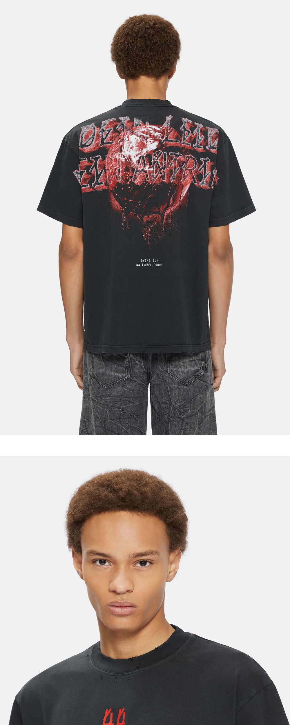 시그니처 레드 컬러 로고 포인트와 뒷면의 강렬한 그래픽이 인상적인 44 레이블 그룹의 빈티지 레이드 티입니다. - 릴렉스 핏 - 스톤 워싱 및 의도적인 데미지 처리 - 전면 로고 프린팅 - 후면 그래픽 프린팅 - '당신의 고통은 나의 원동력'이라는 의미의 후면 텍스트 - 높이감 있는 넥라인 립