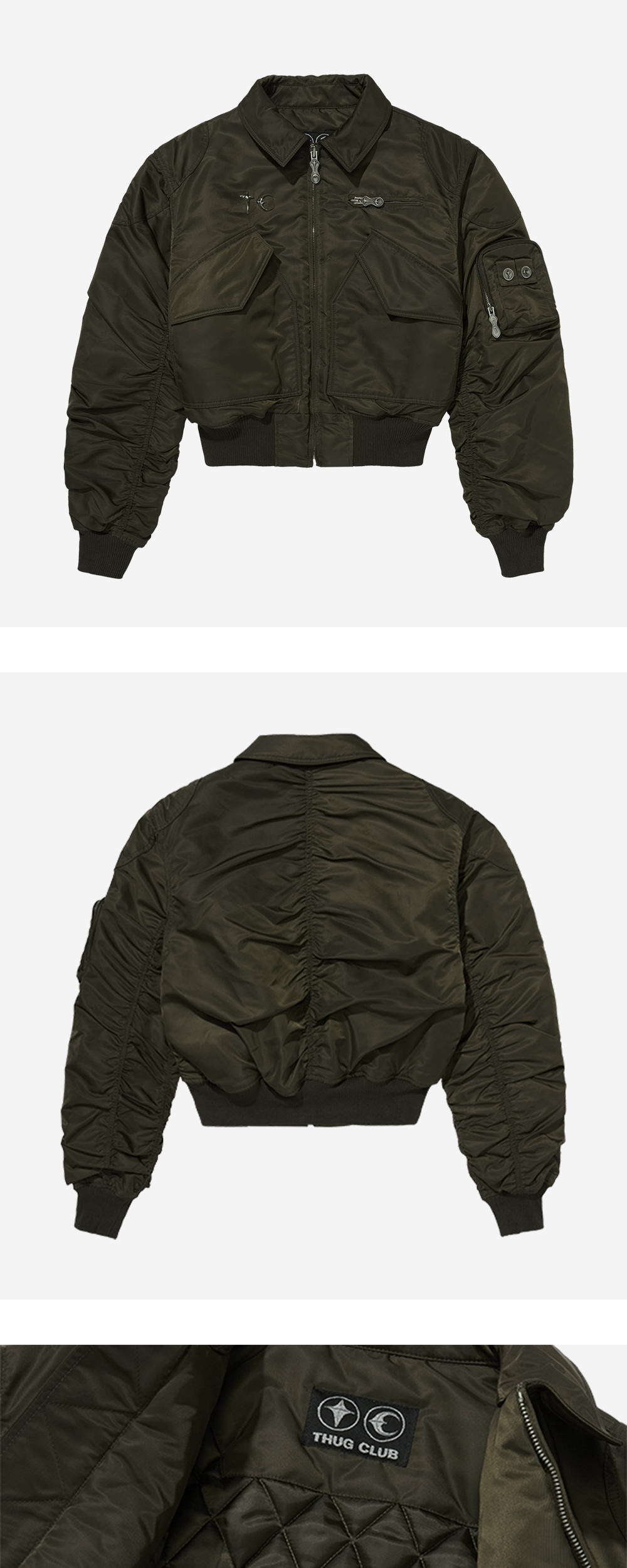 항공 점퍼를 떠그 클럽의 감성으로 재해석한 윙리스 버드 자켓입니다. - 전면에 적용된 TC 엠블럼 - 탄탄한 조직감의 나일론 소재 - 좌측 소매 포켓 디테일 - 후면 및 소매에 적용된 셔링 디테일 - 오버사이즈 핏 * 리벳, 엠블럼이 떨어질 위험이 있어서 건조기 사용 불가하며 손세탁을 권장합니다. * M, L, XL 사이즈는 2, 3, 4 사이즈와 동일합니다.