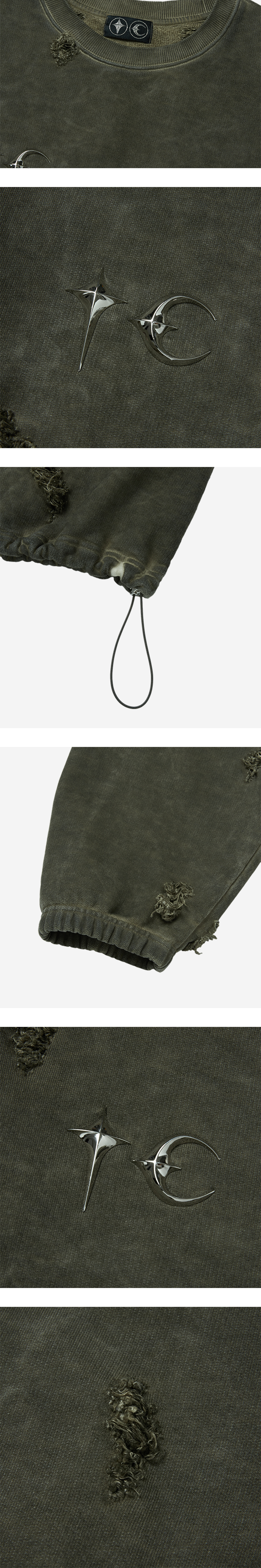 물 빠진 듯한 색감과 데미지 디테일이 빈티지한 느낌을 주는 떠그 클럽의 스웨트셔츠입니다. - 전면 및 후면에 적용된 TC 엠블럼 - 조직감이 큰 헤비 코튼 소재 - 밑단 스트링으로 실루엣 조절 가능 - 데미지 워싱 디테일 - 오버사이즈 핏 * 리벳, 엠블럼이 떨어질 위험이 있어서 건조기 사용 불가하며 손세탁을 권장합니다. * M, L, XL 사이즈는 2, 3, 4 사이즈와 동일합니다.