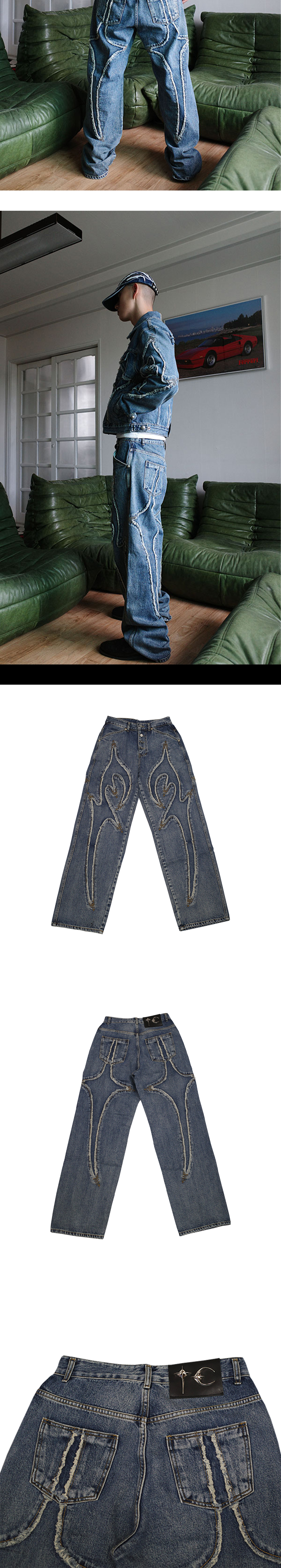수작업으로 제작된 떠그 클럽의 아이코닉한 아이템, 트라이벌 데님 팬츠입니다. - 프리미엄 라인 - 핸드메이드 - 크롬 도금 및 빈티지 가공된 부자재 디테일 - 후면 소가죽 패치 및 TC 스터드 * M, L, XL 사이즈는 2, 3, 4 사이즈와 동일합니다.