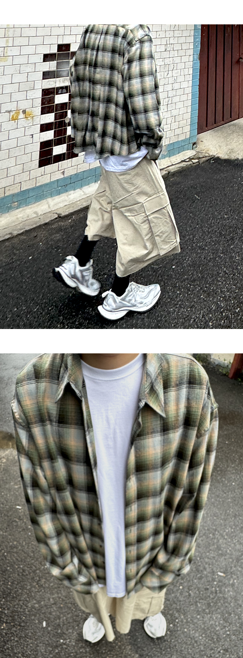언더마이카 무.74 안티 Fxxking 로고 플레이 베이직 롱슬리브 플란넬 셔츠 베이지 그린
