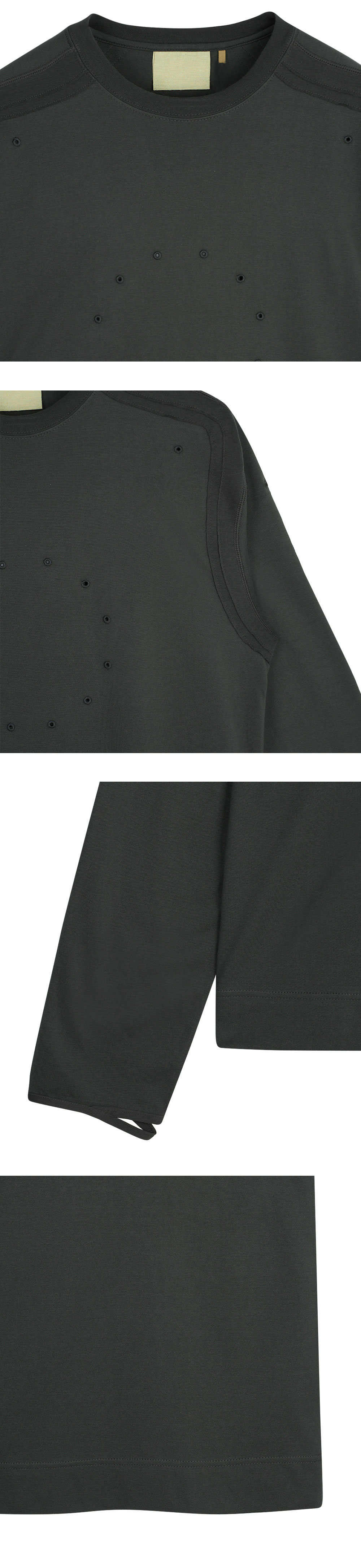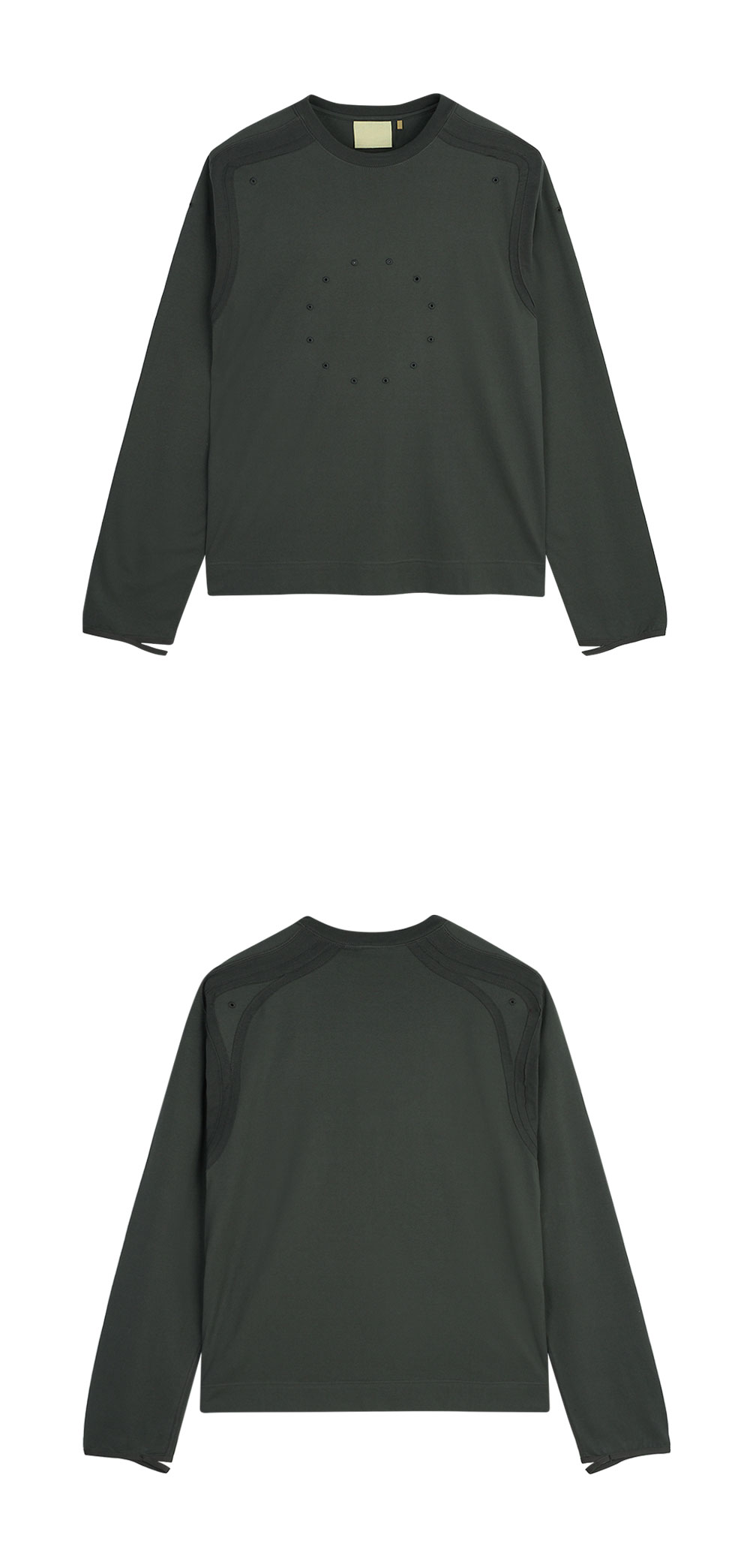 미래적인 디자인에 기능적인 디테일까지 더한 지안 예의 오빗 롱 티셔츠입니다. - 어깨에 적용된 라인은 '오빗'을 형상화한 디자인 - 넥라인 및 어깨 배색 디테일 - 전면 및 어깨에 적용된 아일렛 - 소매 썸홀 디테일