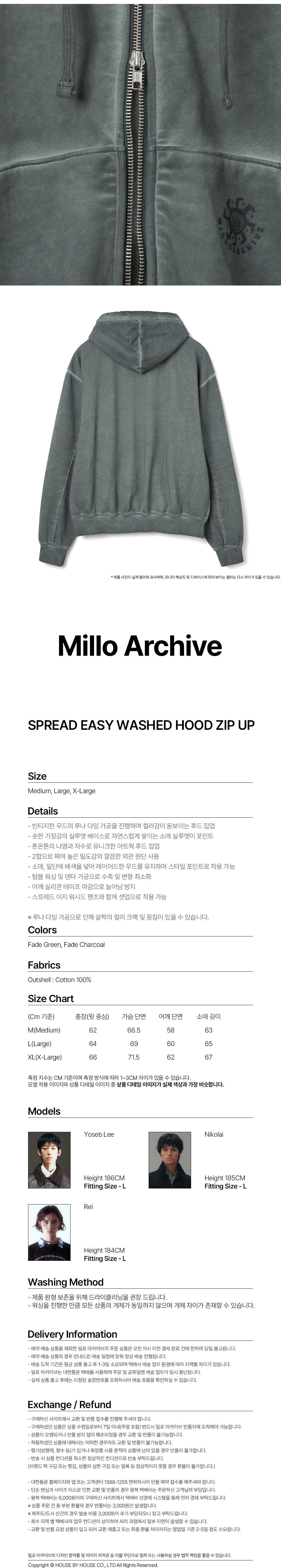 - 빈티지한 무드의 루나 다잉 가공을 진행하여 컬러감이 돋 보이는 후드 집업 - 숏한 기장감의 실루엣 베이스로 자연스럽게 쌓이는 소매 실루엣이 포인트 - 톤온톤의 나염과 자수로 유니크한 아트웍 후드 집업 - 2합으로 짜여 높은 밀도감의 깔끔한 외관 원단 사용 - 소매, 밑단에 배색을 넣어 레이어드한 무드를 유지하며 스타일 포인트로 착용 가능 - 텀블 워싱 및 덴타 가공으로 수축 및 변형 최소화 - 어깨 실리콘 테이프 마감으로 늘어남 방지 - 스프레드 이지 워시드 팬츠와 함께 셋업으로 착용 가능
