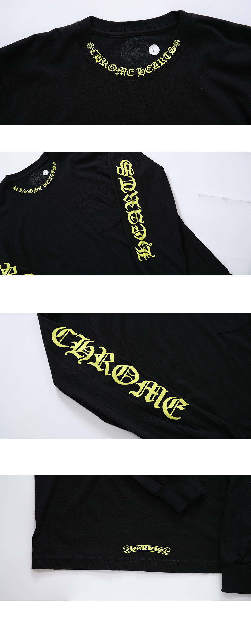 Chrome Hearts Neck Script Logo Long Sleeve T-Shirt Black Llime 크롬하츠 넥 스크립트 로고 롱 슬리브 티셔츠 블랙 라임 *상품 상태 새상품 N등급 *소재 면 100% *사이즈: L (측정 방법에 따라 사이즈에 일부 오차가 있을 수 있습니다.) *구성품: 자체 보증서, 폴리싱천
